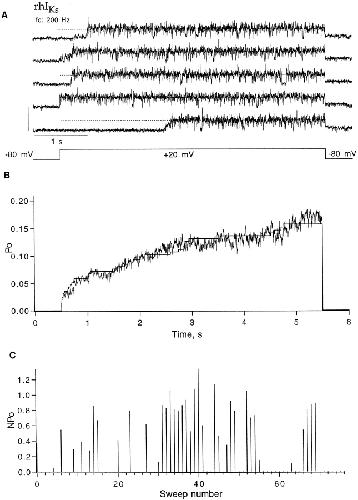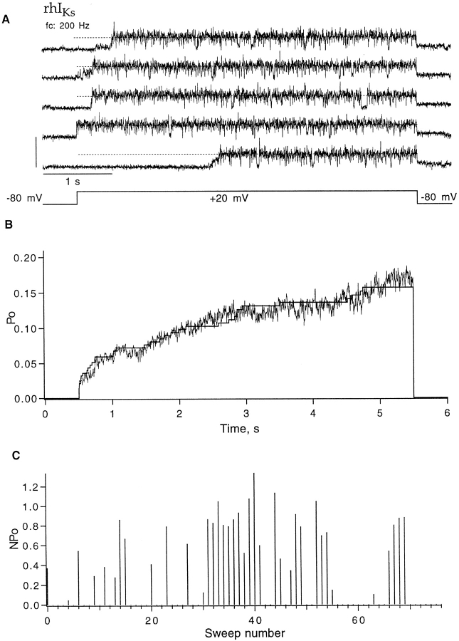 Figure 8. Behavior of rhIKs channels at 20 mV; same three-channel patch as in Fig. 7. (A) Five successive sweeps showing activity from only one channel. (B) The ensemble mean time course obtained from 77 sweeps (noisy trace) shows an instantaneous onset followed by a slow activation phase. The maximum open probability was 0.17. Superimposed is the corrected one-channel first latency F1 scaled by 0.8. (C) Diary plot of nPo. Currents were elicited by depolarizations to +20 mV, 5-s duration, delivered at 8-s intervals from a holding potential of −80 mV. Of a total 77 sweeps, 37 showed some activity; 11 of those showed a second channel opening during depolarization, and one sweep showed three channels open simultaneously. |