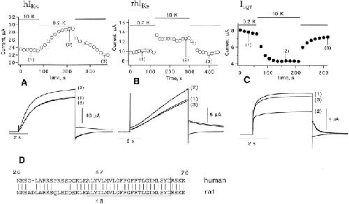 Figure 9. Effect of extracellular potassium on peak current of hIKs, rhIKs, and ILQT in the two-electrode voltage clamp. (A) Magnitude of hIKs current at the end of 5-s depolarizations to +30 mV as the bath solution was switched between 0.2 and 10 mM K+. The lower panel shows current traces corresponding to the times indicated at top. (B) rhIKs current; (C) ILQT current; (D) the amino acid sequences of human and rat minK in the vicinity of the putative transmembrane region (box). |