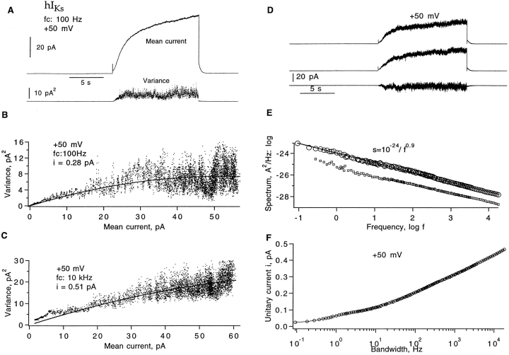 Figure 2. Fluctuation analysis of hIKs currents. (A) Mean current and time-dependent variance computed from 30 sweeps filtered at 100 Hz. The current was induced by +50-mV depolarizing pulses from a −80 mV holding potential in a cell-attached patch recording. Pulses were delivered every 32 s. (B) Mean–variance plot of 100 Hz–filtered currents. A fit of Eq. 1 yields unitary current iv = 0.28 pA and number of channels (n) = 368; the corresponding apparent open probability Pmax = 0.43. (C) Mean–variance plot from a total of 20 sweeps at 10 kHz bandwidth from the same patch. In this case, 12-s depolarizations to +50 mV were delivered every 32 s. The fit yields iv = 0.51 and Pmax = 0.24. (D) A pair of successive current traces and their difference filtered at 1 kHz; same set of data as in A. (E) The top trace is the resulting power spectrum of currents from 30 sweeps after correction for background noise. The contribution Sshot from ion transport during channels opening was estimated according to Sshot = 2e0I = 1.4 · 10−29 A2/Hz and was subtracted. The solid line indicates a power-law fit S(f) = 10−24/f 0.9 A2/Hz. The mean current was 45 pA, and the unitary current estimate is = 0.47 pA at 20 kHz bandwidth. The lower trace shows the spectrum (values plotted one decade lower in the graph for clarity) computed from another representative data set, where the mean current was 39 pA; the unitary current is = 0.44 pA at 20 kHz. (F) Dependence of apparent unitary current is (Eq. 3) on filter cut-off frequency at +50 mV. Variance was calculated from the numeric integral of the power spectrum over the frequency range 0.1 Hz–10 kHz. |