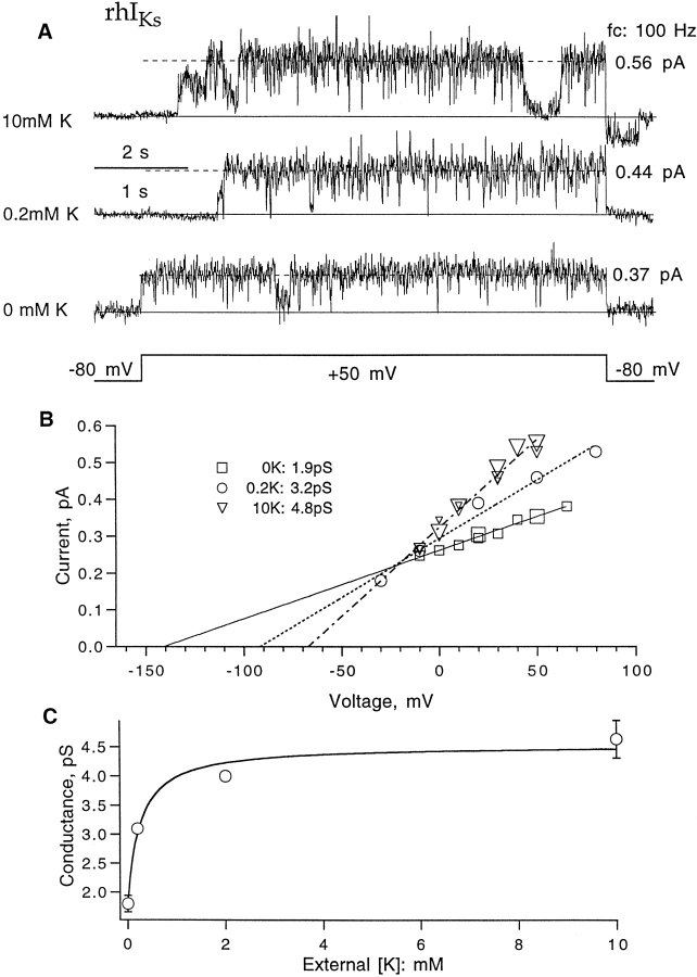 Figure 10. Single-channel conductance of rIKs channels with different external K+ solutions. (A) Representative current traces induced by +50-mV depolarizing pulses from −80-mV holding potential. Data were filtered at 100 Hz. (B) Single-channel current as a function of voltage obtained from double-Gaussian fits to amplitude histograms of traces. Fitted lines have slopes of 1.9, 3.2, and 4.8 pS for 0, 0.2, and 10 mM external K+, respectively. (C) External potassium dependence of single channel conductance. Error bars represent SEM (n = 2 for 0 mM and n = 4 for 10 mM; the points at 0.2 and 2 mM K+ are single observations). The superimposed fit is the function γ = 1.8 + 2.8/(1 + 0.5 mM/[K]) pS. |