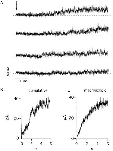 Figure 3. Activation of wild-type IKs channels in inside-out patches in symmetrical 100-mM KCl solution. (A) Four traces from a patch showing channels opening after depolarization to 40 mV (arrow) from a holding voltage of −80 mV; 600 ms of the 6-s pulse is shown; data sampled at 4 kHz and filtered at 1 kHz. (B) Cumulative current of 30 sweeps of the patch shown in A. (C) Single trace of another patch with many channels by the protocol in B.