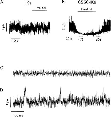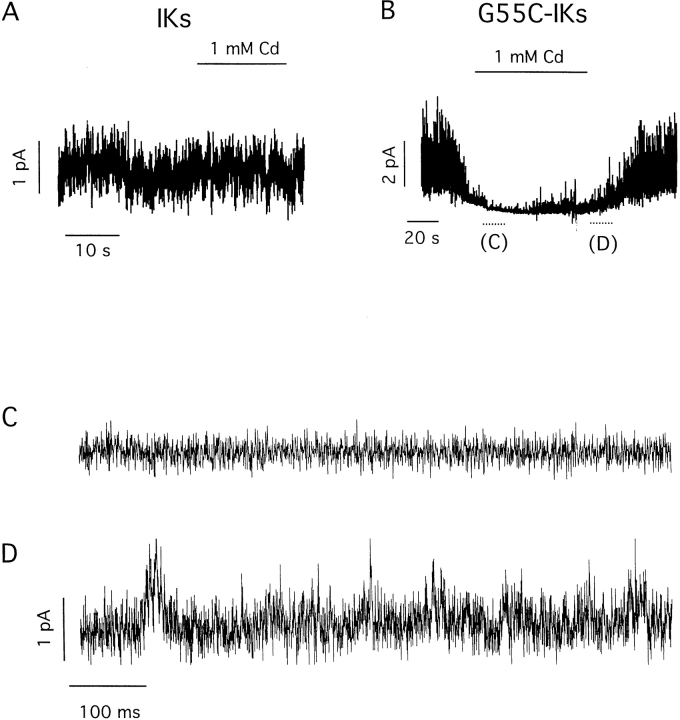 Figure 4. Single-channel activity of IKs channels formed with wild-type or G55C minK in the presence and absence of external Cd2+. Currents were recorded in outside-out patches containing a few channels held at 60 mV in symmetrical 100-mM KCl solution. (A) IKs channels formed with wild-type minK are insensitive to 1 mM Cd2+ (exposure indicated by bar). (B) IKs channels formed with G55C minK are blocked by 1 mM Cd2+ (exposure indicated by bar). (C and D) Expanded traces from the indicated portions of B. Sampled at 4 kHz, filtered at 30 Hz (A and B), or 1 kHz (C and D).