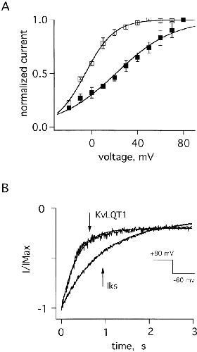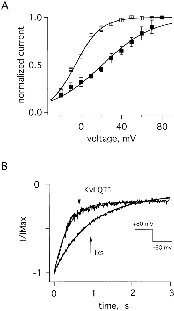 Figure 5. Gating attributes of KvLQT1 and IKs channels in excised patches. (A) Normalized open probabilities (I/IMax) for KvLQT1 channels (□) and IKs channels (▪). Peak tail current at −60 mV was measured after a 6-s prepulse to voltages of −20 to 80 mV. The curves are normalized to 80-mV prepulse value. Theoretical lines are constructed with the Boltzmann function: 1/{1 + exp[ez(V1/2 − V)/kT]}, where z is the equivalent valence, e the elementary charge, V1/2 the voltage at which the curve is half maximal (see Table I), k the Boltzmann constant, and T the absolute temperature; for KvLQT1 channels, z = 2.0 ± 0.1; for IKs channels, z = 1.0 ± 0.1. (B) Normalized tail currents in a patch at −60 mV. Currents were elicited by a 6-s pulse to 80-mV voltage (inset). Theoretical lines are single exponential fits to the deactivation time course; results from many patches are in Table I.