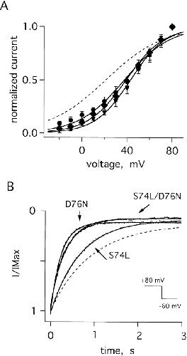 Figure 9. Gating attributes of mutant IKs channels. (A) Normalized open probabilities (I/IMax) for cells with D76N IKs channels (•, z = 1.3 ± 0.2), S74L IKs channels (▾, z = 1.6 ± 0.1), and S74L-D76N IKs channels (♦, z = 1.3 ± 0.2); protocols, theoretical fits, and equivalent valences (z) as in Fig. 5; the dotted line is the curve for wild-type IKs channels from Fig. 5 A. (B) Normalized tail currents at −60 mV for D76N, S74L, and D76N-S74L IKs channels; the dotted line is the curve for wild-type IKs channels from Fig. 5 B. Currents were elicited after a 6-s test pulse to 80 mV. Theoretical lines were constructed as described in the legend to Table I.
