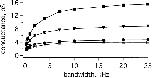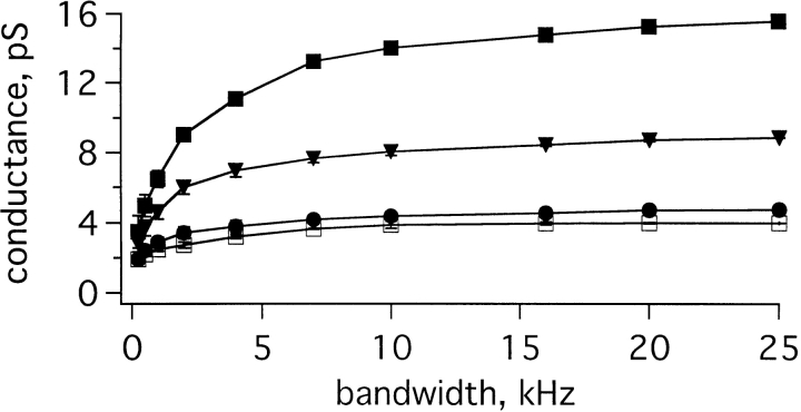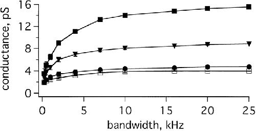 Figure 11. Calculated unitary conductances as a function of the experimental bandwidth. Curves shown for KvLQT1 channels (□), IKs channels (▪), D76N IKs channels (•), and S74L IKs channels (▾). The curves were obtained measuring the variance at 70 mV, using cut-off frequencies from 0.25 to 25 kHz, and then scaled the value of conductance determined at 25 kHz. Data were sampled at 80 kHz and digitally filtered at the indicated frequencies. Each curve represents the average of three patches.