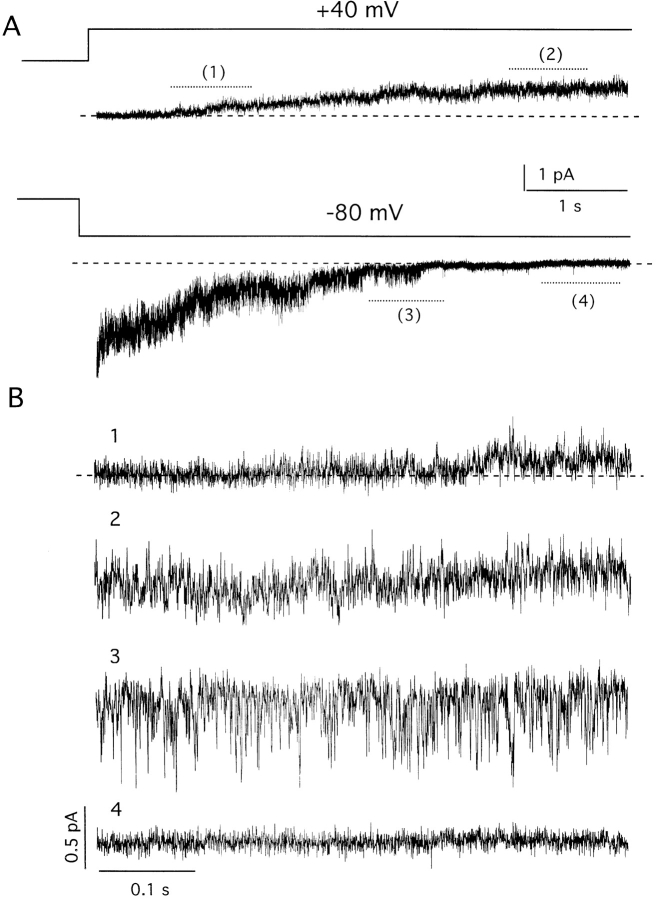 Figure 2. Single-channel activity recorded from an inside-out patch containing a few wild-type IKs channels in symmetrical 100-mM KCl solution. (A) Current activation at 40 mV from a holding voltage of −80 mV. (B) Current deactivation on return to −80 mV. Expanded traces 1–4 are from the indicated portions of A and B. Data were sampled at 4 kHz and filtered at 1 kHz.