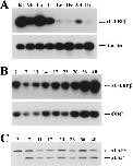 Fig. 2. Expression pattern of the xC/EBPβ gene. cDNA template was prepared against total RNA from either adult Xenopus kidney (Ki), muscle (Mu), lung (Lu), liver (Li), brain (Br), ovary (Ov), adipose tissue (Ad) and heart (He) (A) or from the following embryonic stages: 2 (cleavage), 7 (blastula), 11 (mid-gastrula), 14 (early neurula), 17 (mid-neurula), 23 (early tailbud), 26 (mid-tailbud), 36 (late tailbud) and 40 (early tadpole) (B). The cDNA was then used for PCR reactions in which primers against either the xC/EBPβ gene or the constitutively expressed β-actin or ODC gene (A and B, respectively) was present. The amplification products were subjected to Southern blot analysis, and their position is indicated by labelled arrows. (C). Western blot analysis was carried out on whole cell extracts from the embryonic stages indicated as described in Section 3. The blotted membranes were probed with rabbit antiserum to rat C/EBPβ ( Poli et al., 1990; Ramji et al., 1993), and the antigenâantibody complexes were detected using the ECL detection system. The positions of the xLAP* and xLAP polypeptides, produced by alternate use of translation initiation codons, are indicated by labelled arrows. The description of changes in band intensity included in the text are based on the replicated outcome of laser densitometric quantification.