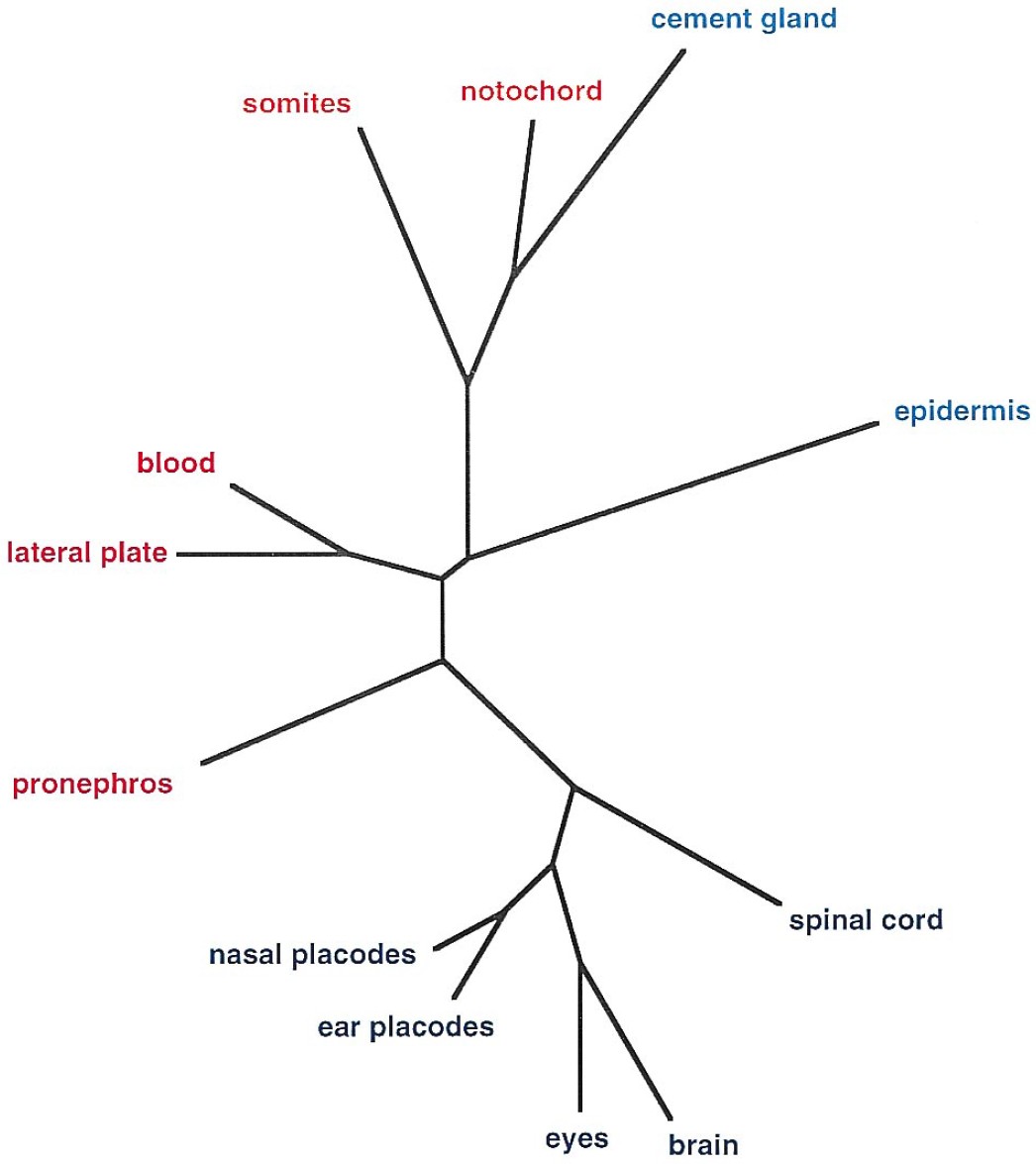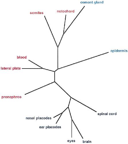 Fig. 8. Analysis of tissue relatedness. Expression profiles of 206 cDNAs expressed in more than one tissue were selected. These profiles were arranged in a matrix and compared among each other using Fitch Margoliash algorithm to compute a tree using the implementation from the Phylip package. Length of lines corresponds relative distance between tissues (issue relatedness. Mesodermal and ectodermal derivatives are coloured in red and blue, respectively. |