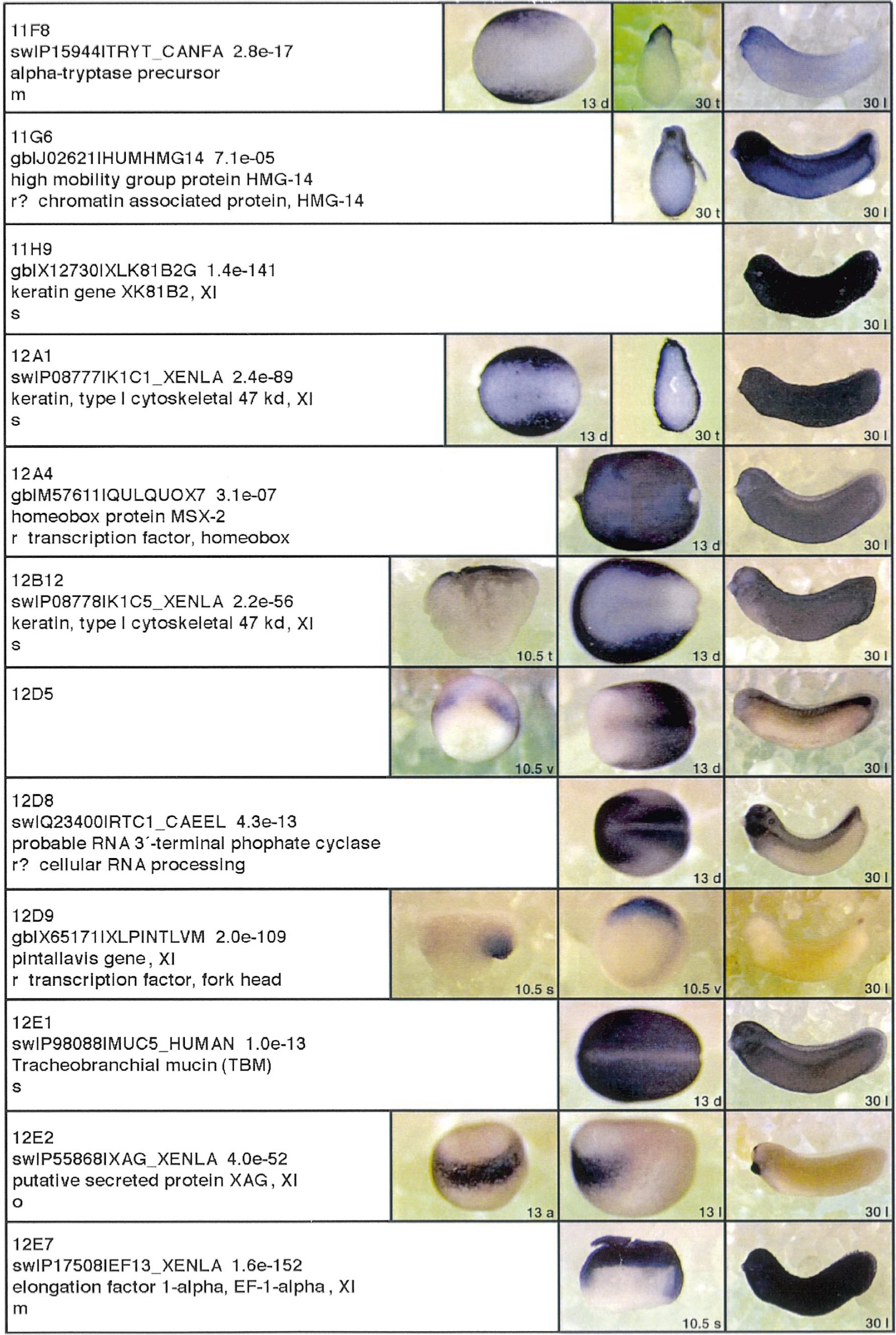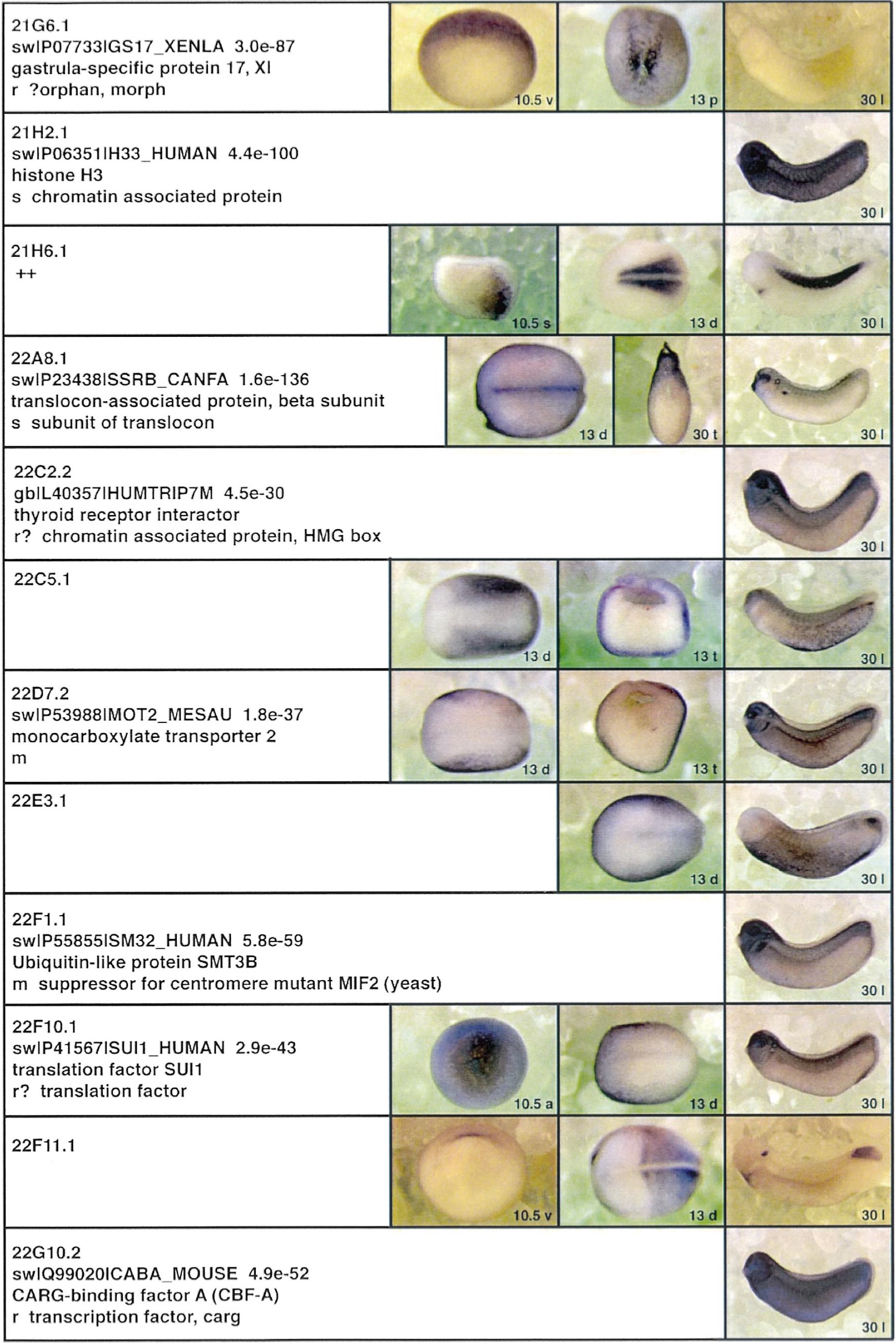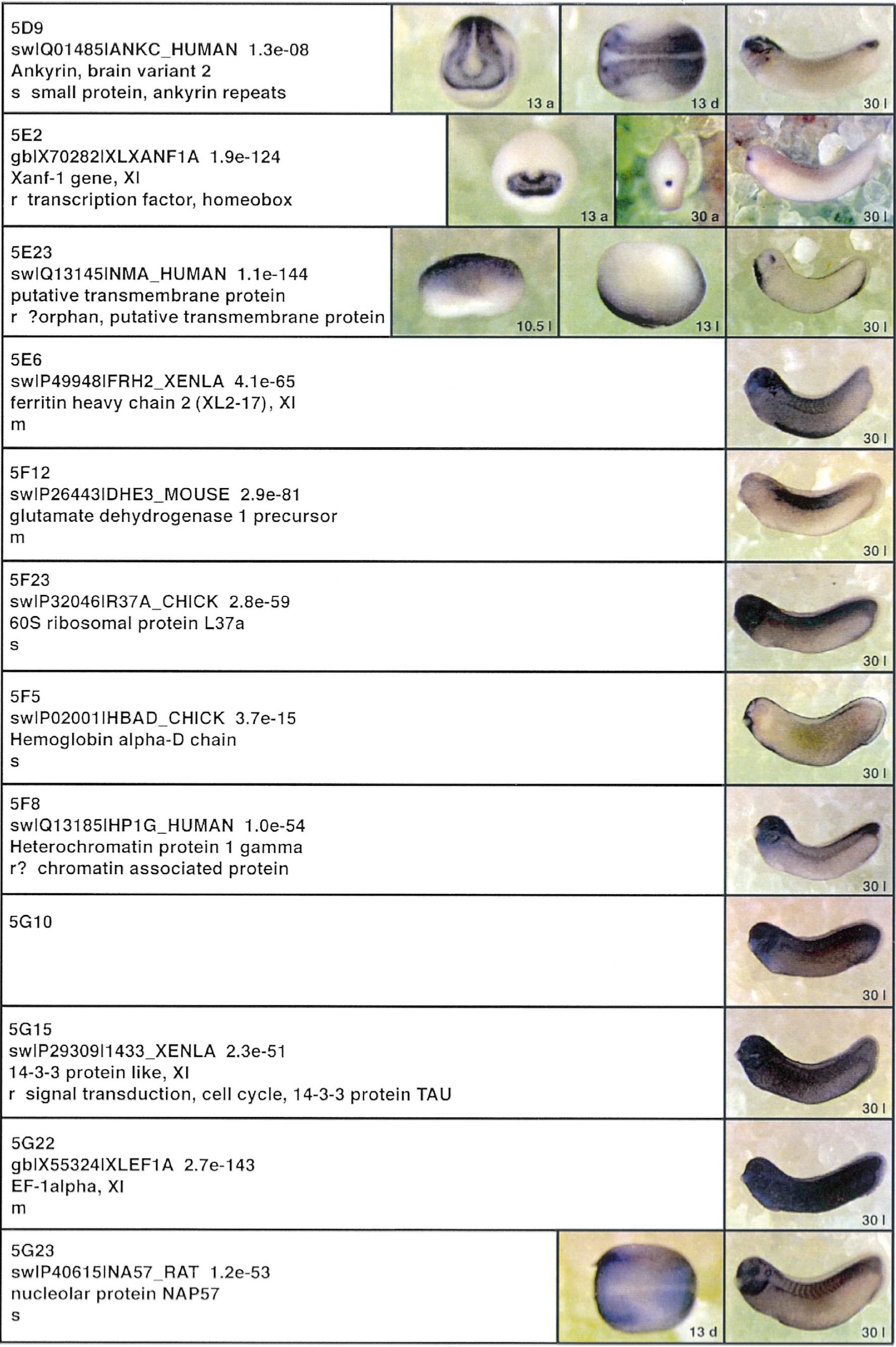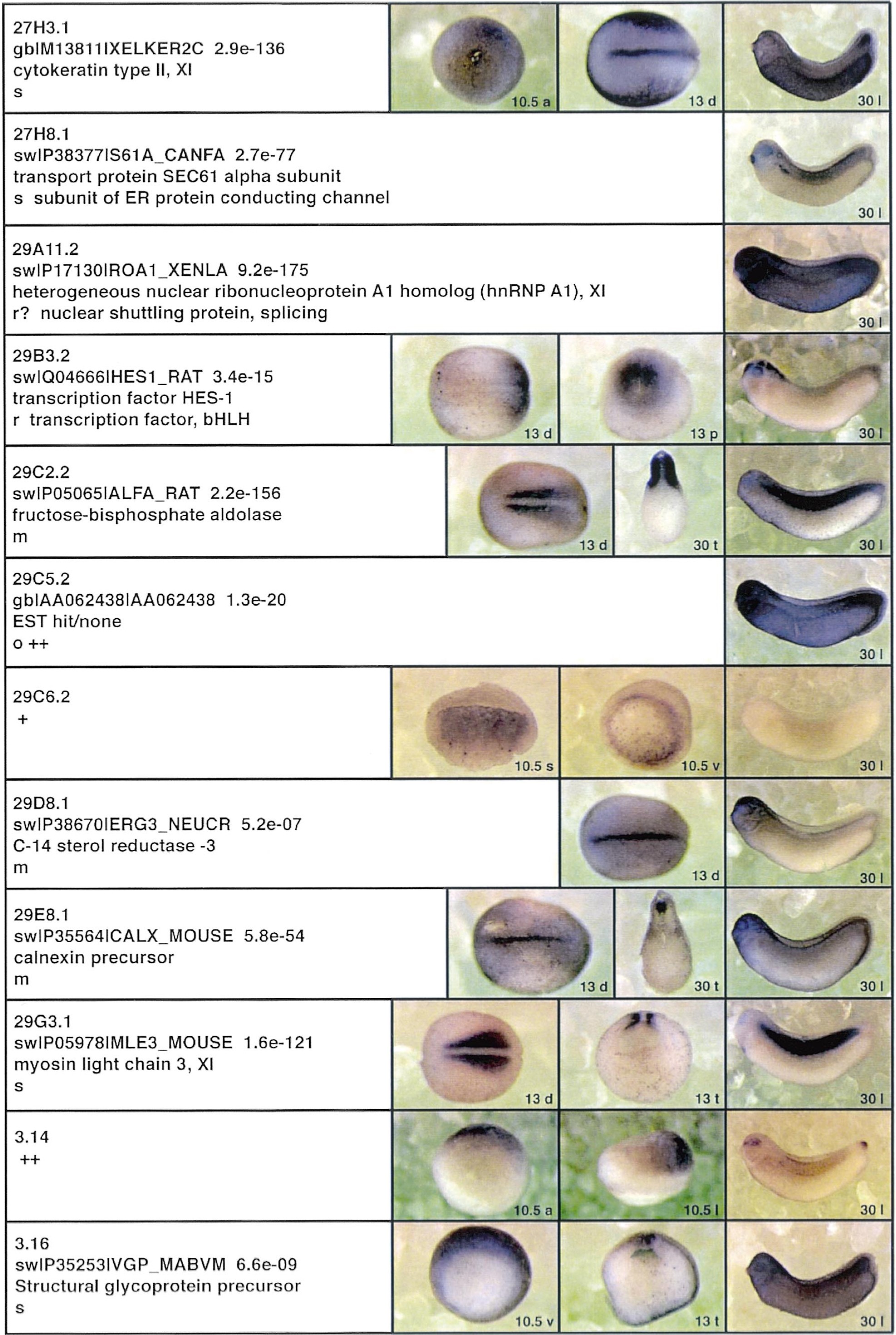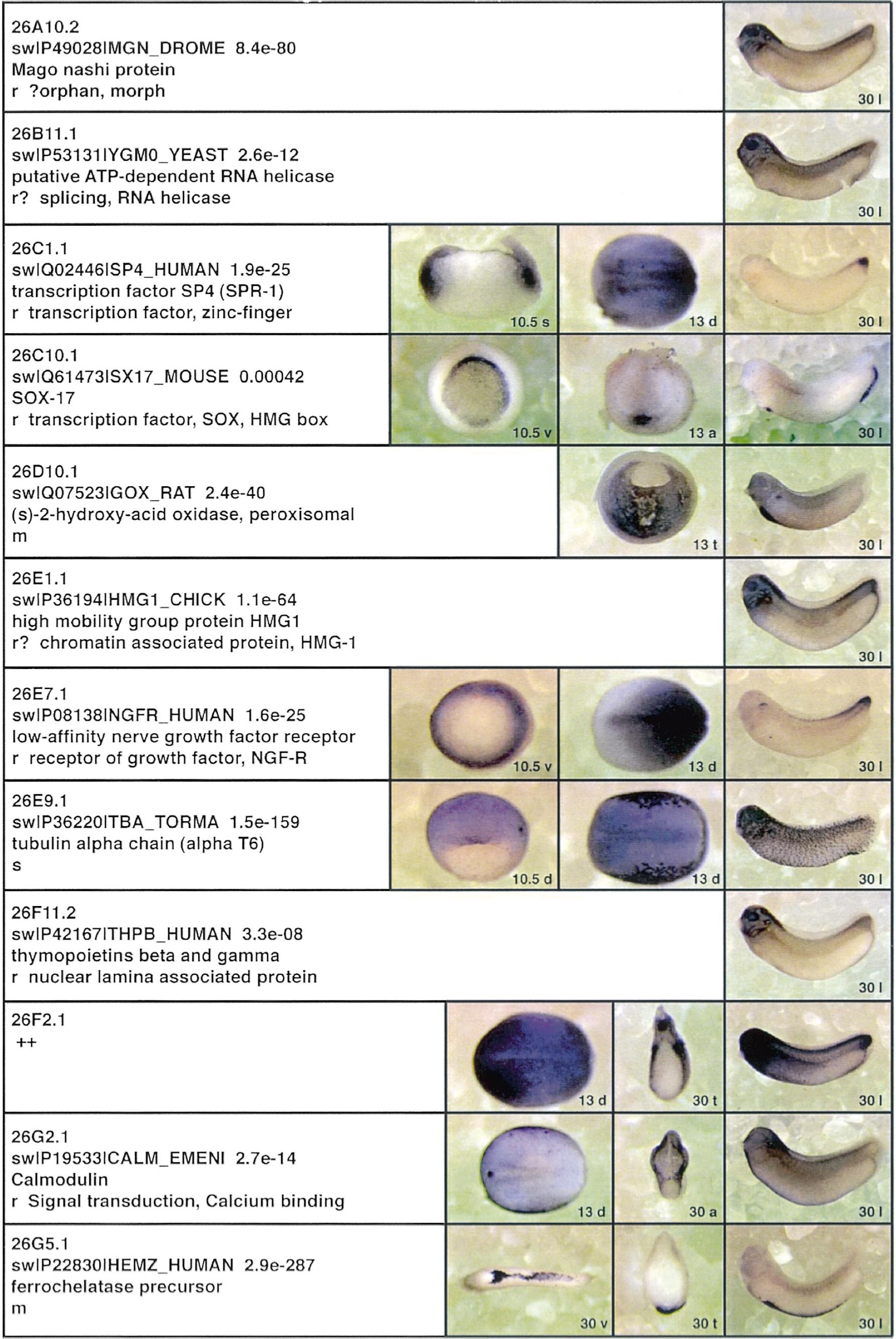 Fig. 3. Whole mount in situ hybridizations, sequence similarities and functional classifications. The left-most part represents the results of sequence similarity searches from 273 partially sequenced cDNAs representing unique, differentially expressed genes: clone name; accession number of best hit, P-value; name of best hit; functional classification. The order of the genes follows first digit sorting, e.g. 1, 10, 2, 20 etc. Abbreviations: o, orphan genes; m, metabolism gene; r, developmental regulator gene; r?, housekeeping regulator gene; s, structural gene; Xl, known Xenopus gene; +, GRAIL1 good coding potential; ++, GRAIL1 excellent coding potential. The P-value is the probability provided by the BLAST programme and calculated using Karlinltschul statistics, that the sequence similarity is due to randomness. For EST hits, the similarities derived from the comparison of the EST or cluster of EST sequences is given. The right-most part shows in situ hybridizations results for stages 10+, 13 and 30. Abbreviations are: a, animal view (stage 10); a, anterior view (stage 30); d, dorsal view; l, lateral view; p, posterior view; s, sagittal section; t, transverse section; v, vegetal view (stage 10); v, ventral view (stage 30). page 12 |