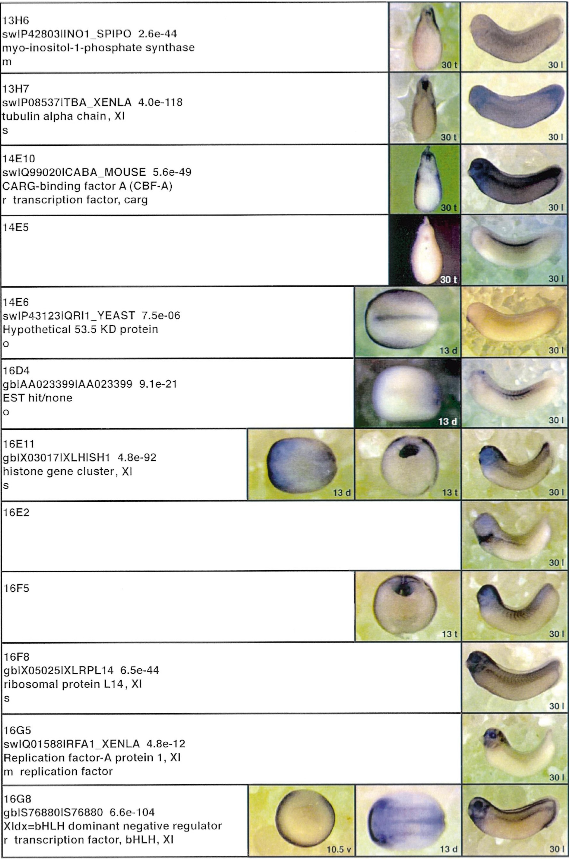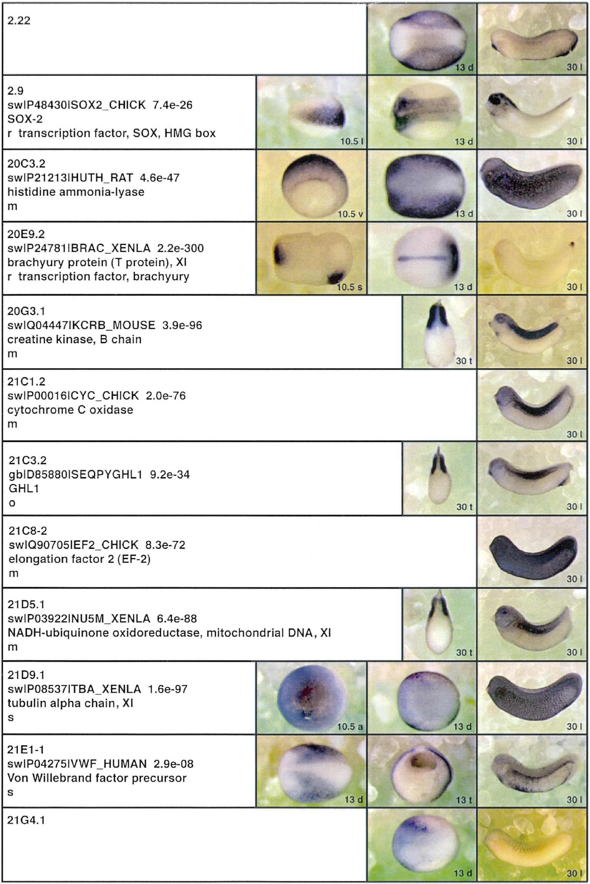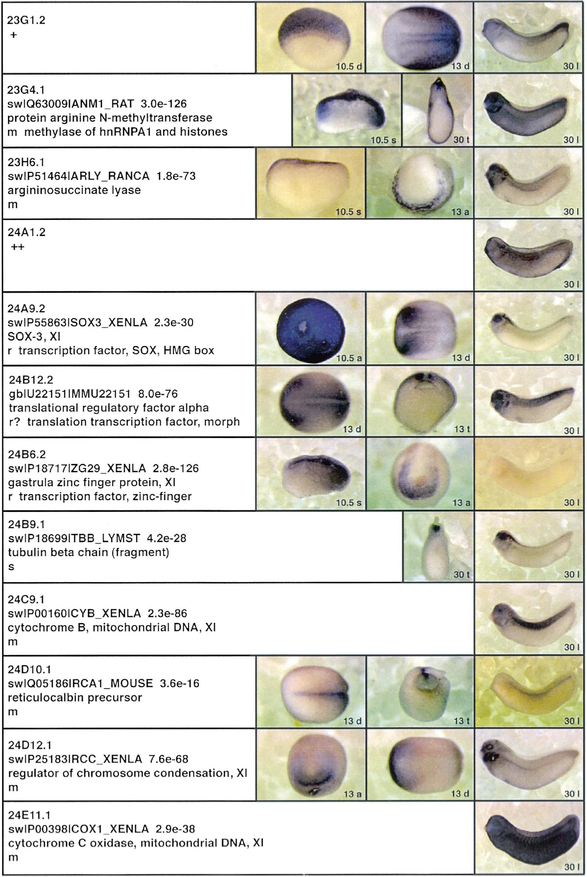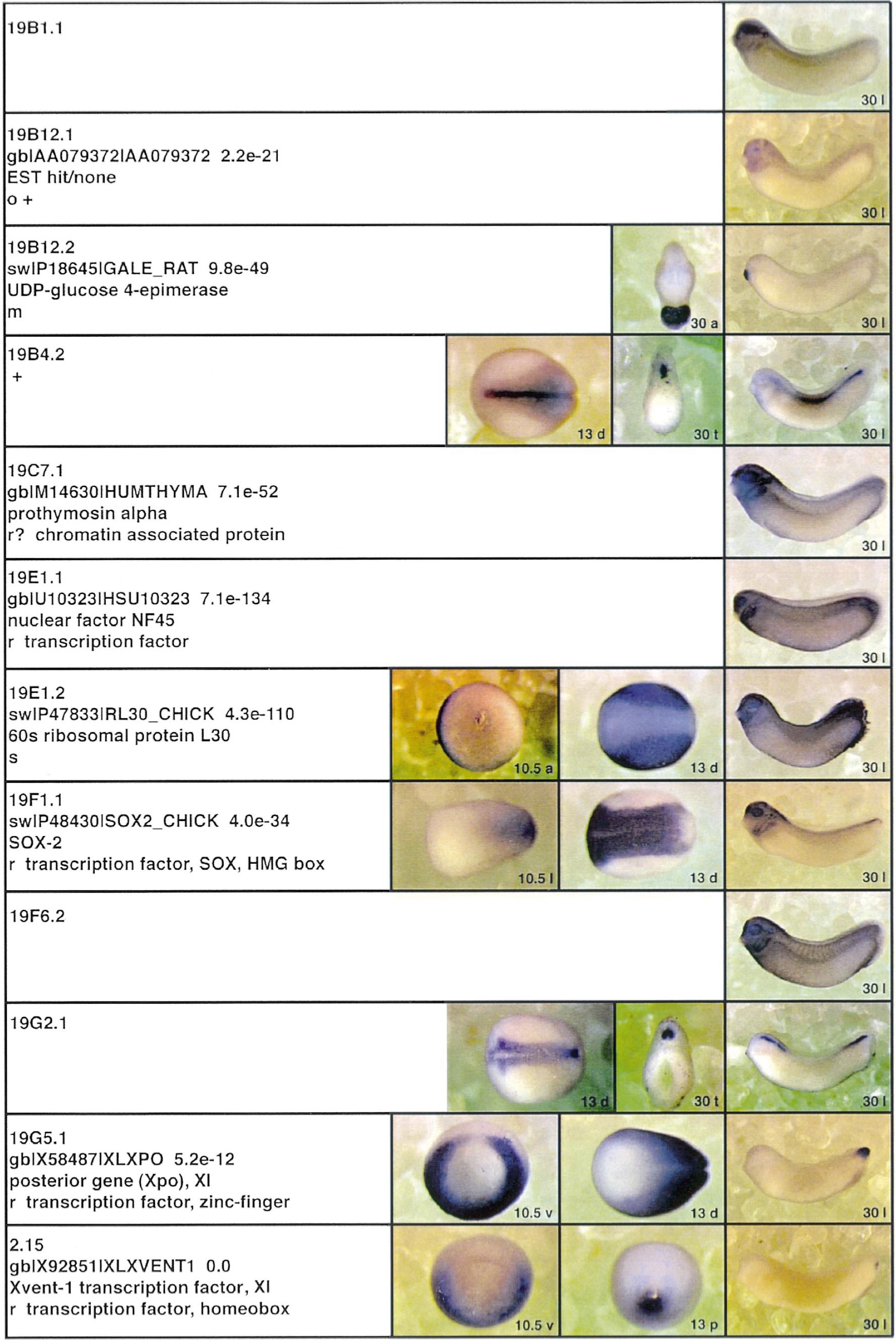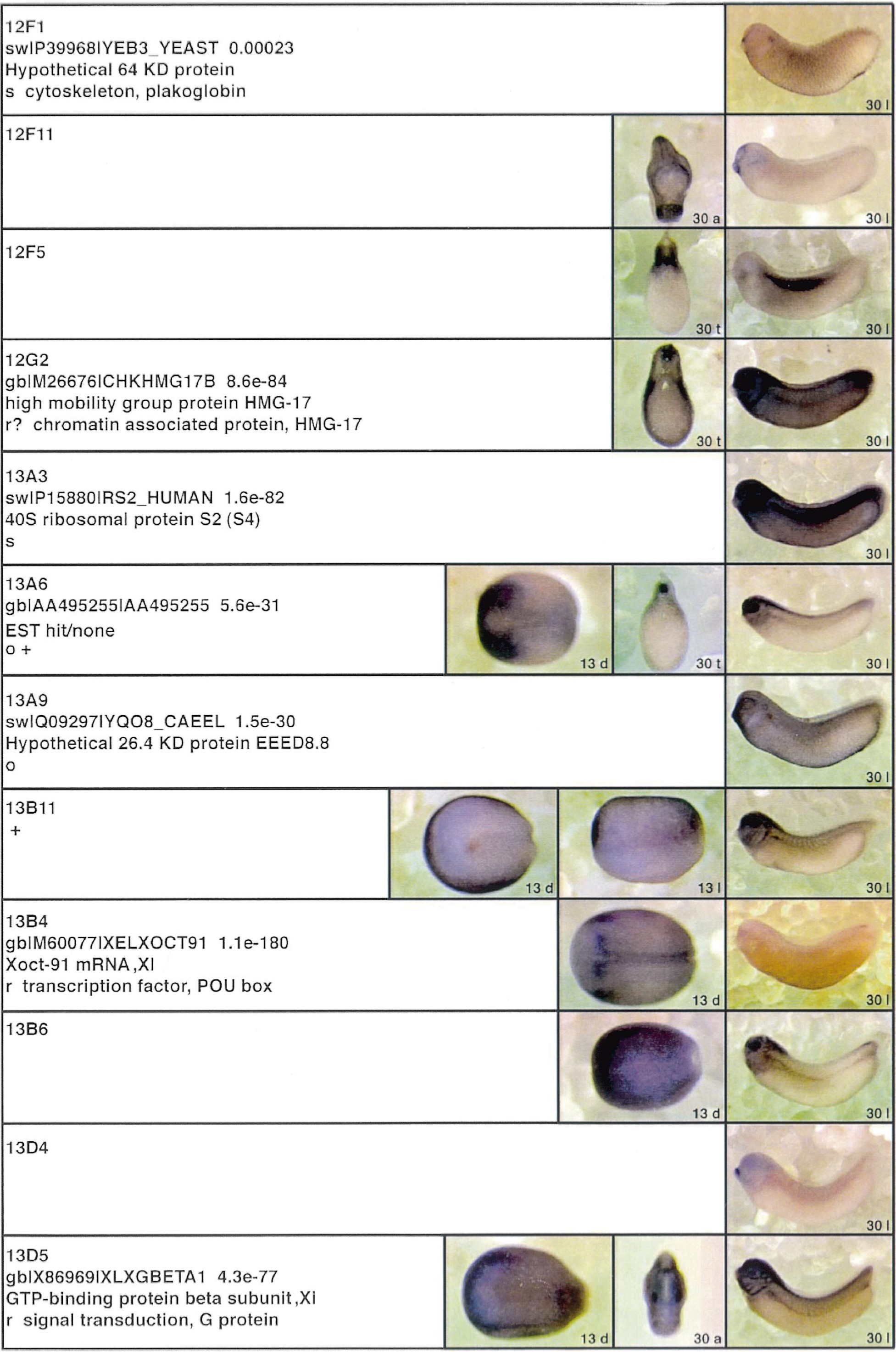 Fig. 3. Whole mount in situ hybridizations, sequence similarities and functional classifications. The left-most part represents the results of sequence similarity searches from 273 partially sequenced cDNAs representing unique, differentially expressed genes: clone name; accession number of best hit, P-value; name of best hit; functional classification. The order of the genes follows first digit sorting, e.g. 1, 10, 2, 20 etc. Abbreviations: o, orphan genes; m, metabolism gene; r, developmental regulator gene; r?, housekeeping regulator gene; s, structural gene; Xl, known Xenopus gene; +, GRAIL1 good coding potential; ++, GRAIL1 excellent coding potential. The P-value is the probability provided by the BLAST programme and calculated using Karlinltschul statistics, that the sequence similarity is due to randomness. For EST hits, the similarities derived from the comparison of the EST or cluster of EST sequences is given. The right-most part shows in situ hybridizations results for stages 10+, 13 and 30. Abbreviations are: a, animal view (stage 10); a, anterior view (stage 30); d, dorsal view; l, lateral view; p, posterior view; s, sagittal section; t, transverse section; v, vegetal view (stage 10); v, ventral view (stage 30). page 12 |