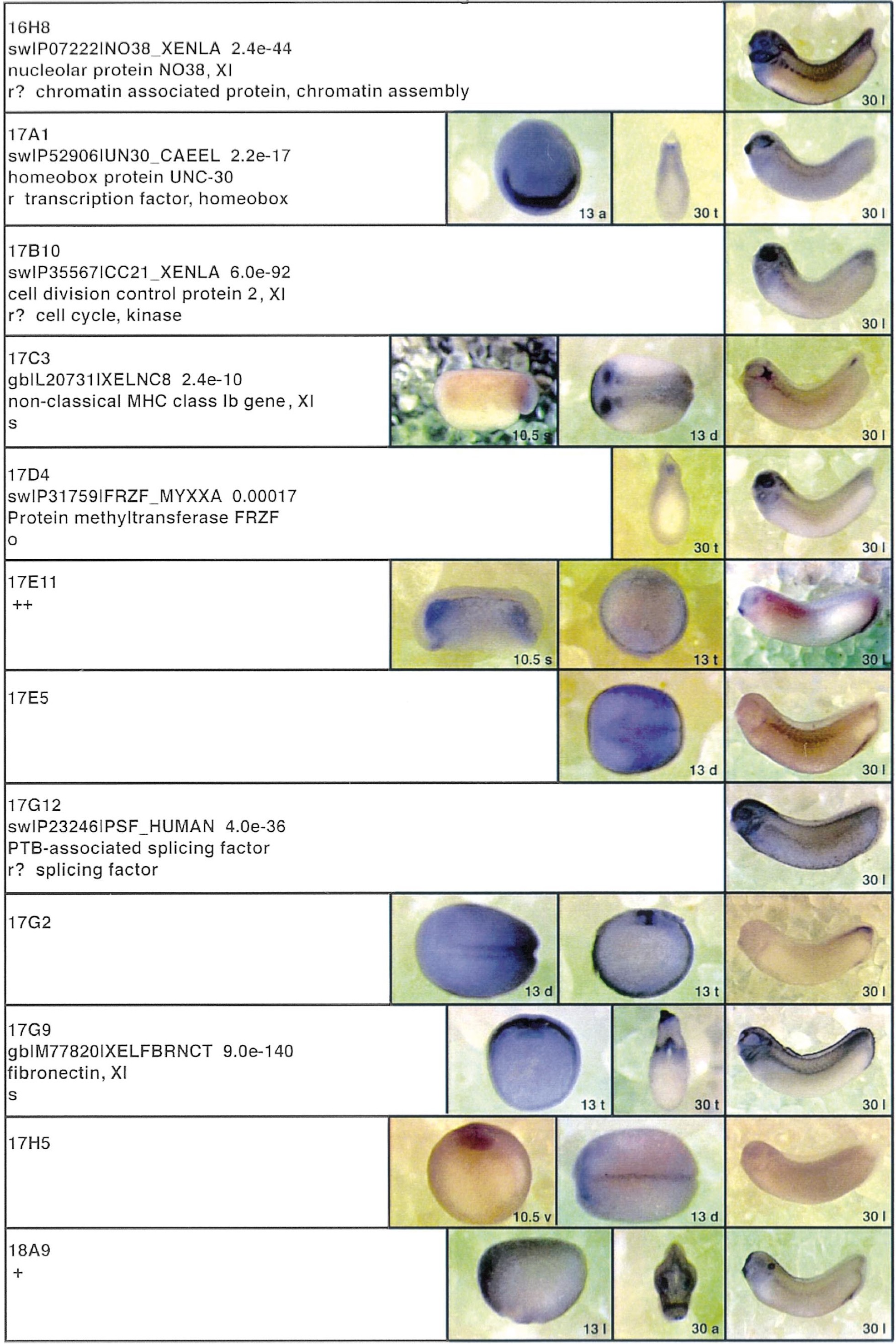 Fig. 3. Whole mount in situ hybridizations, sequence similarities and functional classifications. The left-most part represents the results of sequence similarity searches from 273 partially sequenced cDNAs representing unique, differentially expressed genes: clone name; accession number of best hit, P-value; name of best hit; functional classification. The order of the genes follows first digit sorting, e.g. 1, 10, 2, 20 etc. Abbreviations: o, orphan genes; m, metabolism gene; r, developmental regulator gene; r?, housekeeping regulator gene; s, structural gene; Xl, known Xenopus gene; +, GRAIL1 good coding potential; ++, GRAIL1 excellent coding potential. The P-value is the probability provided by the BLAST programme and calculated using Karlinltschul statistics, that the sequence similarity is due to randomness. For EST hits, the similarities derived from the comparison of the EST or cluster of EST sequences is given. The right-most part shows in situ hybridizations results for stages 10+, 13 and 30. Abbreviations are: a, animal view (stage 10); a, anterior view (stage 30); d, dorsal view; l, lateral view; p, posterior view; s, sagittal section; t, transverse section; v, vegetal view (stage 10); v, ventral view (stage 30). page 9 |