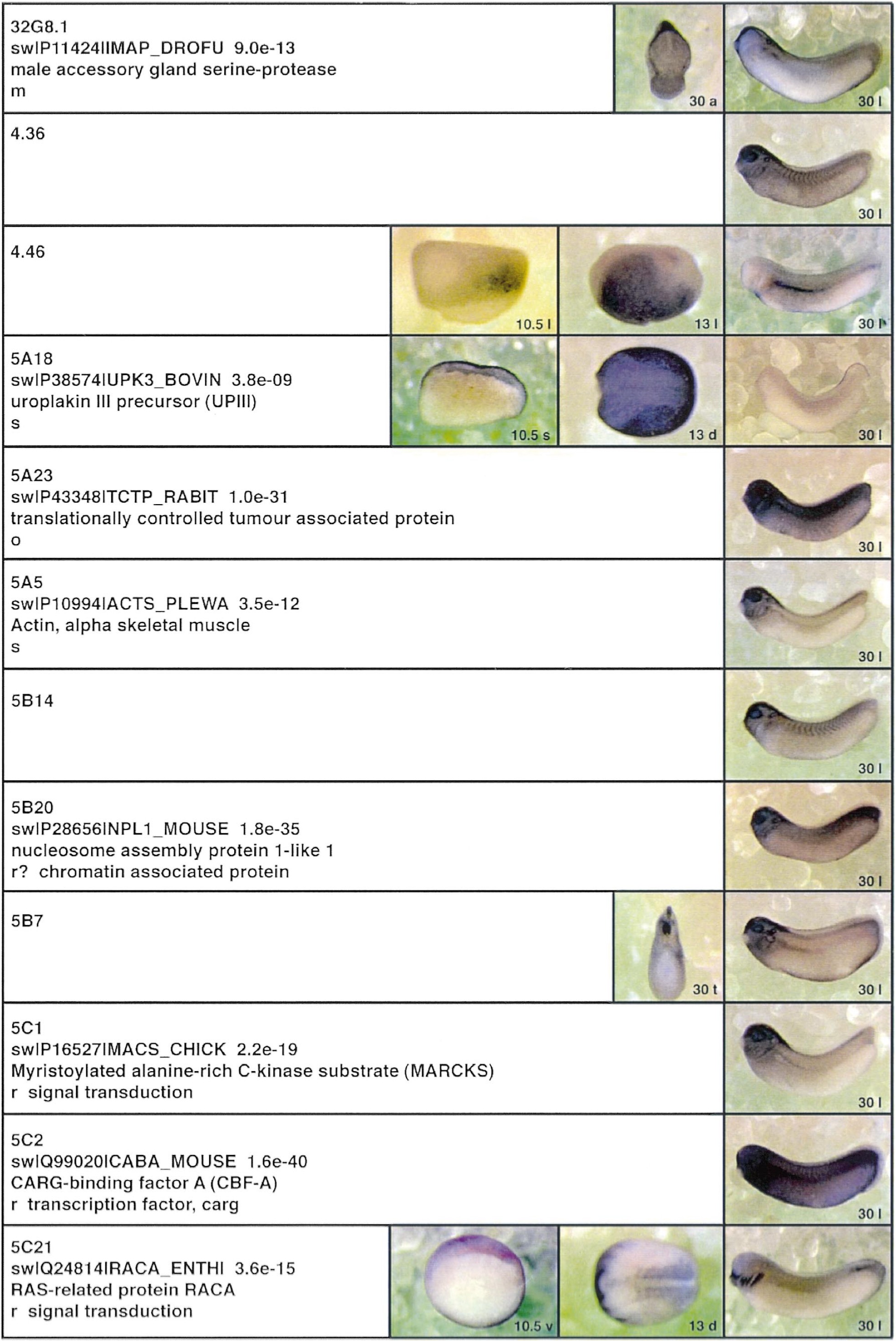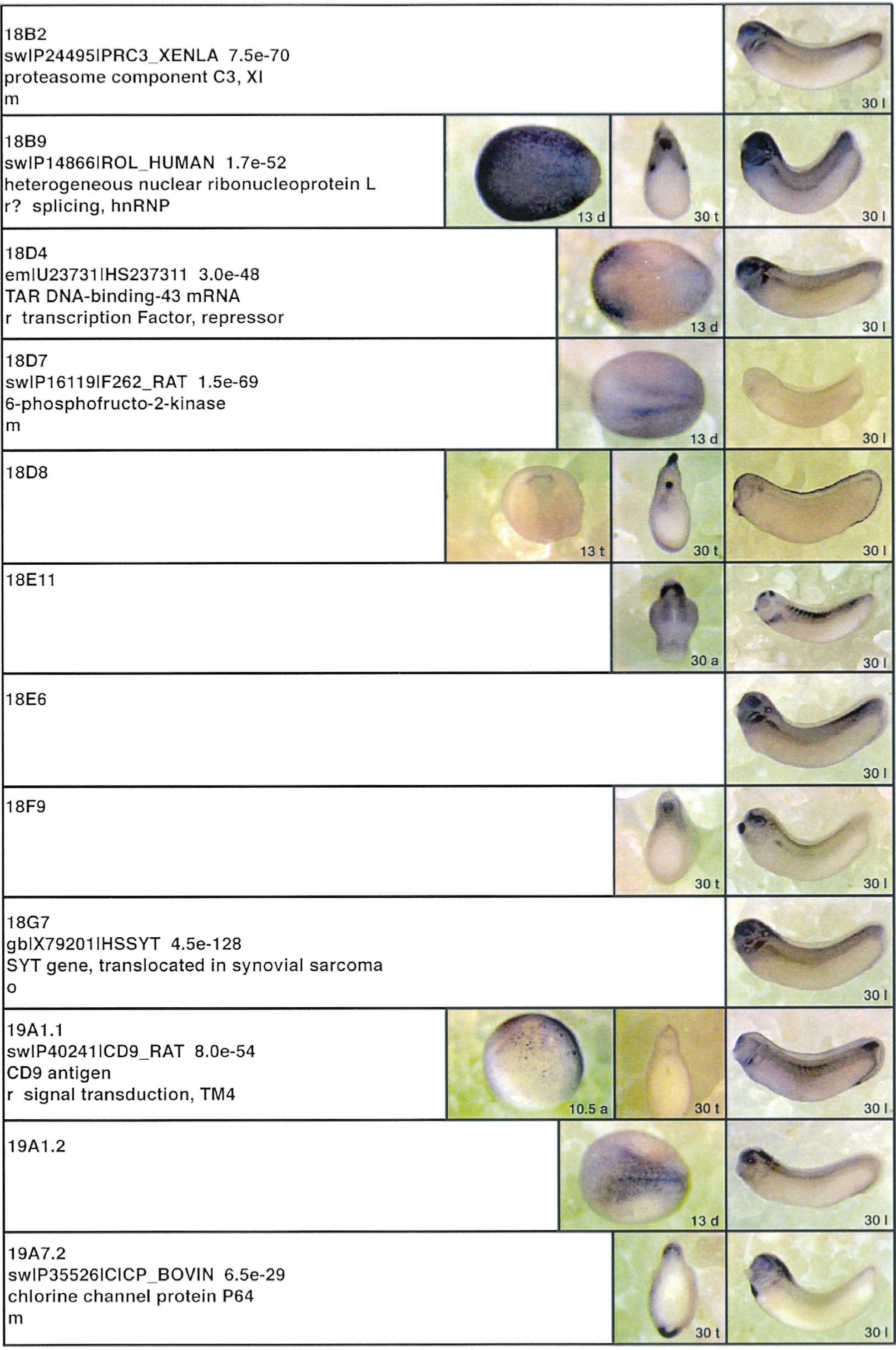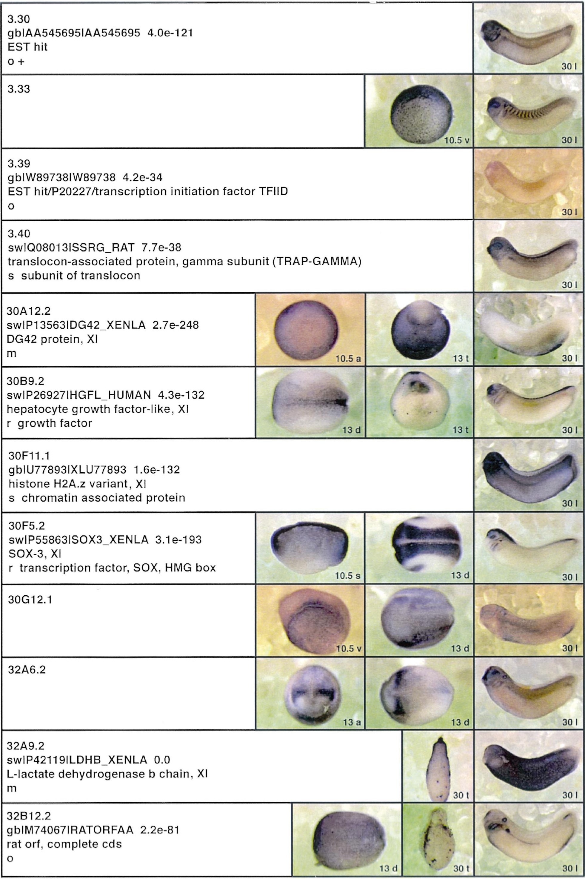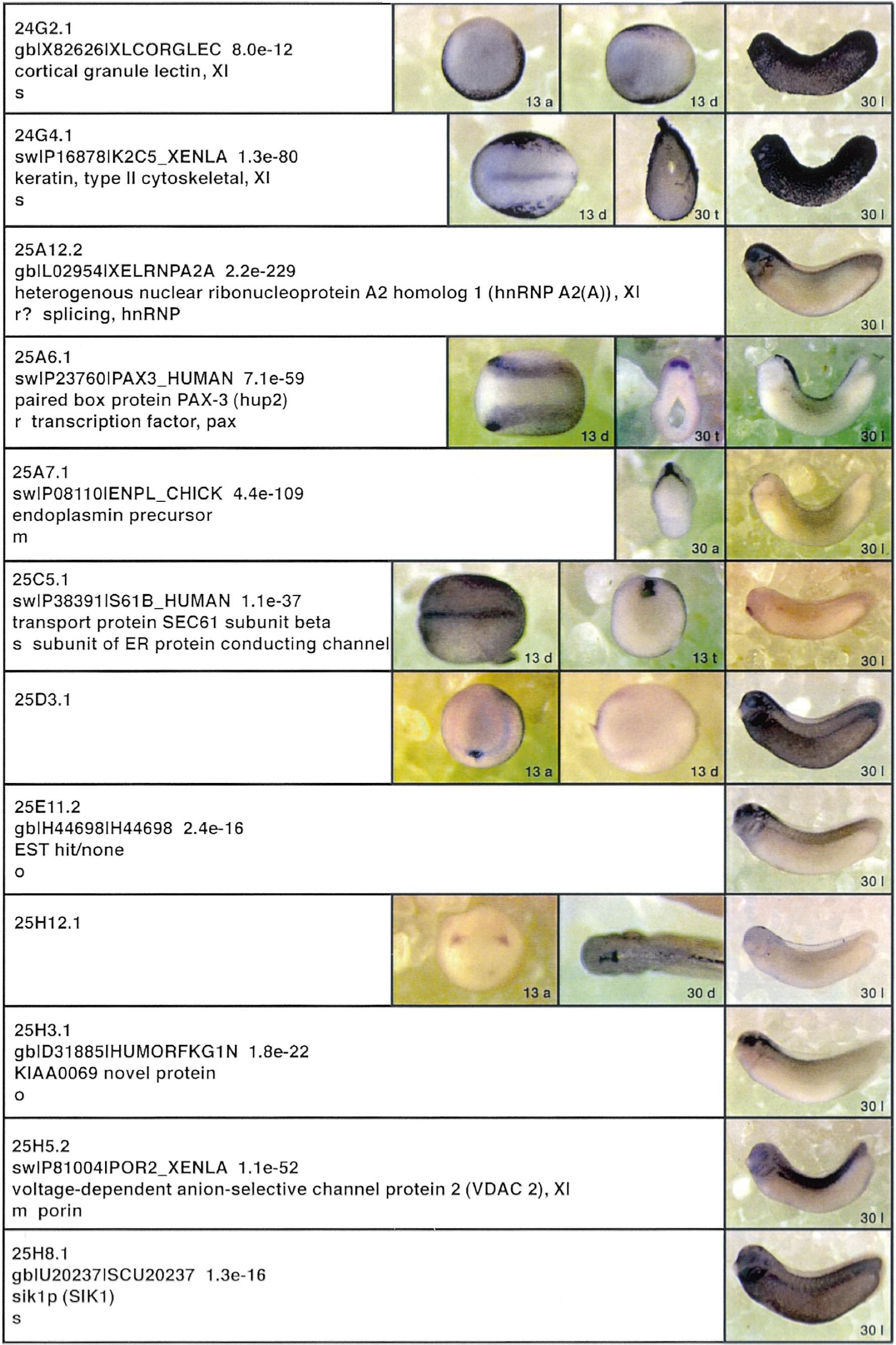 Fig. 3. Whole mount in situ hybridizations, sequence similarities and functional classifications. The left-most part represents the results of sequence similarity searches from 273 partially sequenced cDNAs representing unique, differentially expressed genes: clone name; accession number of best hit, P-value; name of best hit; functional classification. The order of the genes follows first digit sorting, e.g. 1, 10, 2, 20 etc. Abbreviations: o, orphan genes; m, metabolism gene; r, developmental regulator gene; r?, housekeeping regulator gene; s, structural gene; Xl, known Xenopus gene; +, GRAIL1 good coding potential; ++, GRAIL1 excellent coding potential. The P-value is the probability provided by the BLAST programme and calculated using Karlinltschul statistics, that the sequence similarity is due to randomness. For EST hits, the similarities derived from the comparison of the EST or cluster of EST sequences is given. The right-most part shows in situ hybridizations results for stages 10+, 13 and 30. Abbreviations are: a, animal view (stage 10); a, anterior view (stage 30); d, dorsal view; l, lateral view; p, posterior view; s, sagittal section; t, transverse section; v, vegetal view (stage 10); v, ventral view (stage 30). page 6 |