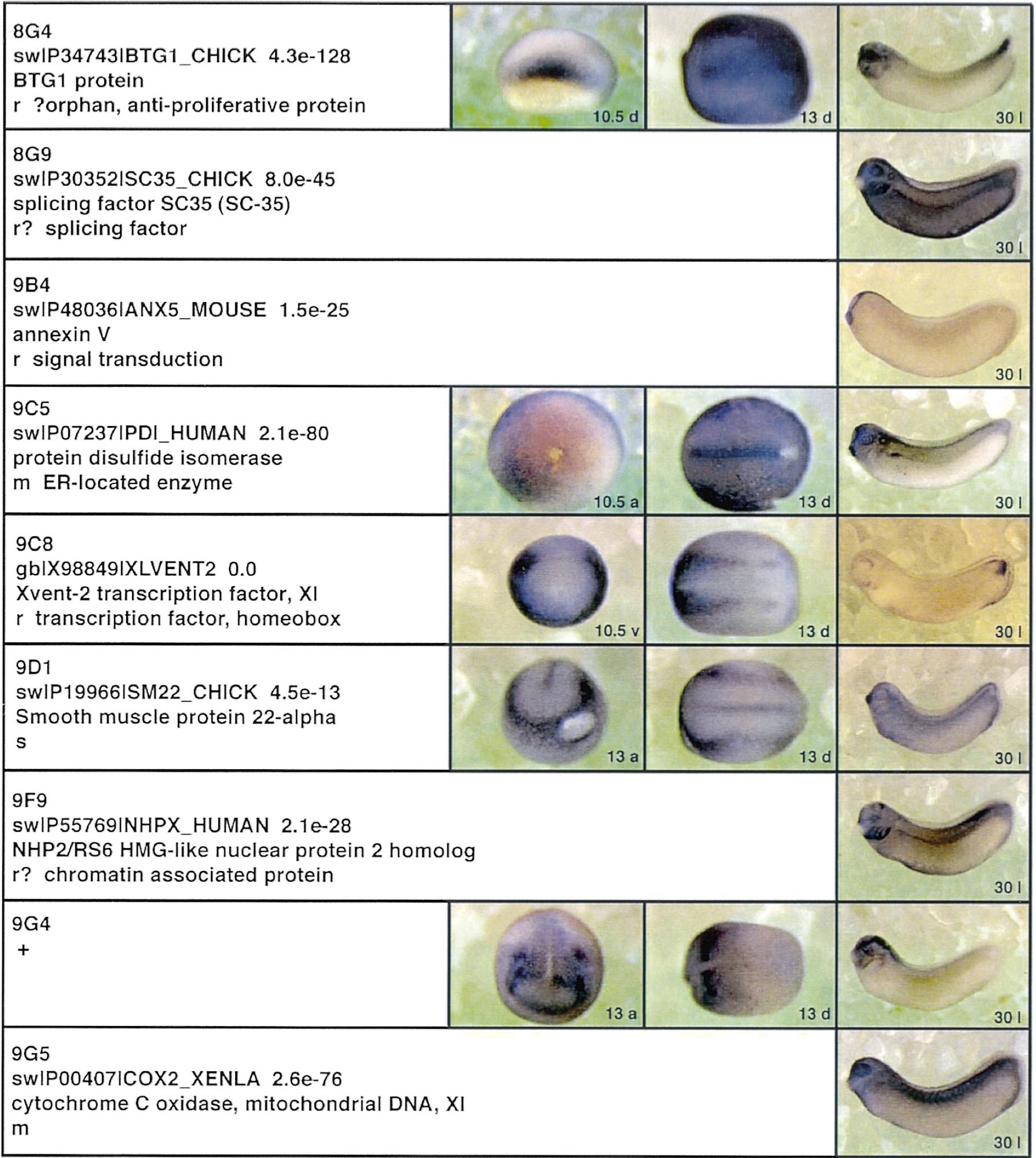 Fig. 3. Whole mount in situ hybridizations, sequence similarities and functional classifications. The left-most part represents the results of sequence similarity searches from 273 partially sequenced cDNAs representing unique, differentially expressed genes: clone name; accession number of best hit, P-value; name of best hit; functional classification. The order of the genes follows first digit sorting, e.g. 1, 10, 2, 20 etc. Abbreviations: o, orphan genes; m, metabolism gene; r, developmental regulator gene; r?, housekeeping regulator gene; s, structural gene; Xl, known Xenopus gene; +, GRAIL1 good coding potential; ++, GRAIL1 excellent coding potential. The P-value is the probability provided by the BLAST programme and calculated using Karlinltschul statistics, that the sequence similarity is due to randomness. For EST hits, the similarities derived from the comparison of the EST or cluster of EST sequences is given. The right-most part shows in situ hybridizations results for stages 10+, 13 and 30. Abbreviations are: a, animal view (stage 10); a, anterior view (stage 30); d, dorsal view; l, lateral view; p, posterior view; s, sagittal section; t, transverse section; v, vegetal view (stage 10); v, ventral view (stage 30). page 8 |