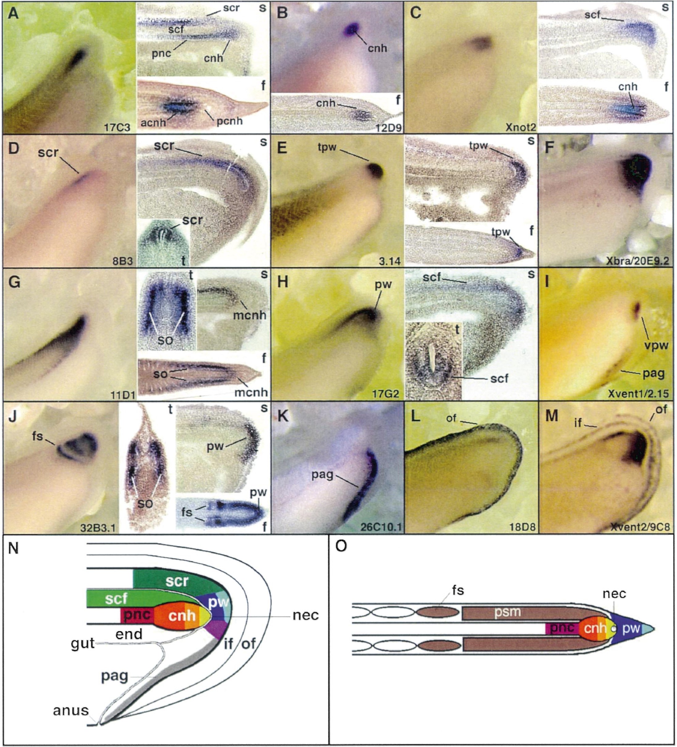 Fig. 5. Tail regionalization. Whole-mount in situ hybridizations were carried out on tailbud embryos. The tail region in lateral view and vibratome sections thereof are shown. (A) Show selected marker gene expression, (N and O) show diagrams summarizing the identified domains in mid-sagittal and frontal view, respectively. Where indicated, frontal (f, posterior to the right), sagittal (s, posterior to the right), or transverse (t, dorsal to the top) vibratome sections are shown. Abbreviations: acnh, anterior chordoneural hinge; cnh, chordoneural hinge; end, endoderm; fs, forming somites; if, inner fin; mcnh, mid chordoneural hinge; of, outer fin; nec, neurenteric canal; pag, post-anal gut; pcnh, posterior chordoneural hinge; psm, presomitic mesoderm; pnc, posterior notochord; pw, posterior wall; scf, spinal cord floor; scr, spinal cord roof; so, somites; tpw, tip of posterior wall; vpw, ventral posterior wall. |