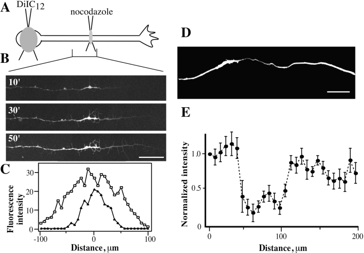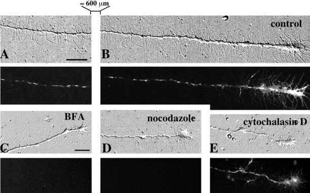 Nerve growth depends on the delivery of cell body-synthesized material to the growing neuronal processes. The cellular mechanisms that determine the topology of new membrane addition to the axon are not known. Here we describe a technique to visualize the transport and sites of exocytosis of cell body- derived vesicles in growing axons. We found that in Xenopus embryo neurons in culture, cell body-derived vesicles were rapidly transported all the way down to the growth cone region, where they fused with the plasma membrane. Suppression of microtubule (MT) dynamic instability did not interfere with the delivery of new membrane material to the growth cone region; however, the insertion of vesicles into the plasma membrane was dramatically inhibited. Local disassembly of MTs by focal application of nocodazole to the middle axonal segment resulted in the addition of new membrane at the site of drug application. Our results suggest that the local destabilization of axonal MTs is necessary and sufficient for the delivery of membrane material to specific neuronal sites.