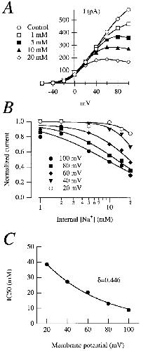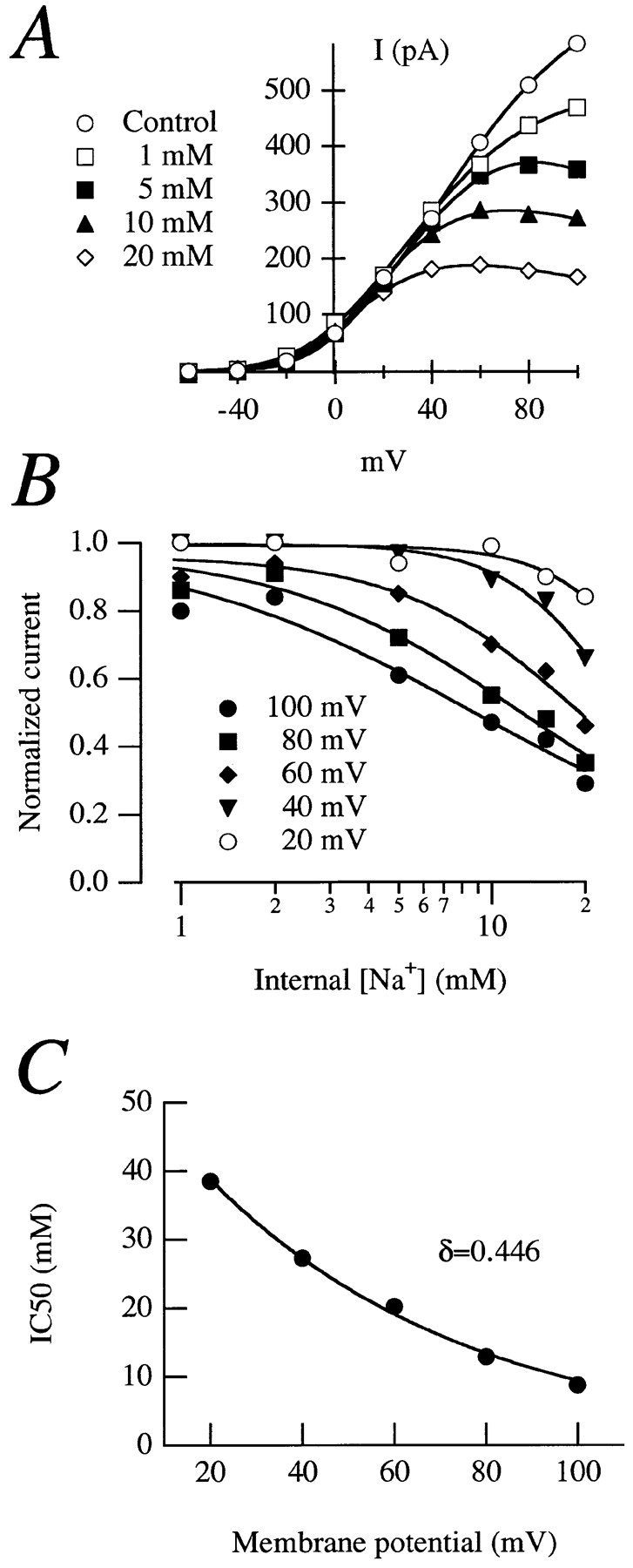 Figure 3. (A) Normalized current–voltage relationships in an inside-out patch from an oocyte expressing rectifying currents in the presence of different internal Na+ concentrations. The stimulation protocol was as the one in Fig. 2. (B) Dose–response plots for effects of Na+. The solid lines are fits to the Hill equation. (C) IC50 plotted versus voltage. The exponential fit to Eq. 1 gave a value for δ of 0.446.