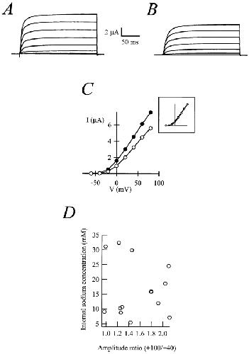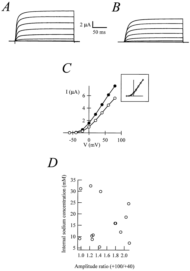Figure 5. Currents recorded from a whole oocyte before (A) and after (B) the injection of 50 nl 2 M NaCl. (C) Current–voltage plots for steady-state currents from A and B. (Inset) The normalized currents. (D) Lack of correlation between the internal Na+ concentration (calculated from the reversal potential of Na+ currents) and the degree of rectification of r-eag currents. The correlation coefficient is −0.1.