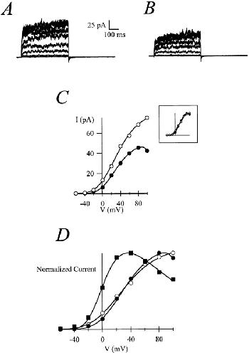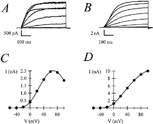 Figure 7. Variability in the degree of blockade by internal Na+ in CHO-K1 cells. (A and B) Raw currents traces obtained from two apparently identical cells (500-ms depolarizations to voltages between −60 and +100 mV, in 20-mV increments). (C and D) Corresponding I-V relationships. The internal solution contained 140 mM KCl and 10 mM NaCl.