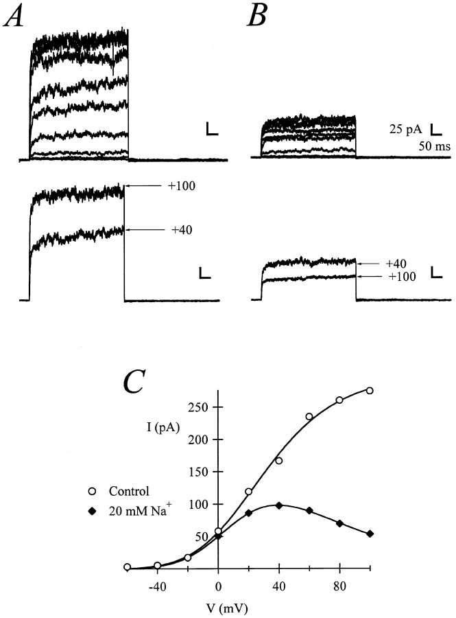 Figure 2. Raw current traces from the same patch in the absence (A) or in the presence of 20 mM NaCl in the internal solution (B). C shows the current–voltage relationships under both conditions. The voltage protocol consisted of a 200-ms depolarization from a holding potential of −80 mV. The amplitude was determined as mean current at the end of the test pulse. The scale bars correspond to 25 pA and 50 ms.