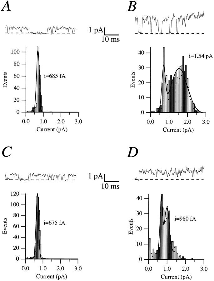 Figure 4. Sample traces and amplitude histograms obtained from the same patch without (A and B) or with (C and D) 5 mM NaCl added to the intracellular side, at either 0 (A and C) or +80 mV (B and D). The single channel currents are obtained from the fit to a Gaussian distribution. The smaller amplitude in the histograms at +80 mV corresponds to the amplitude of the flickering of the channel, and remains constant in the absence (B) or in the presence (D) of Na+.