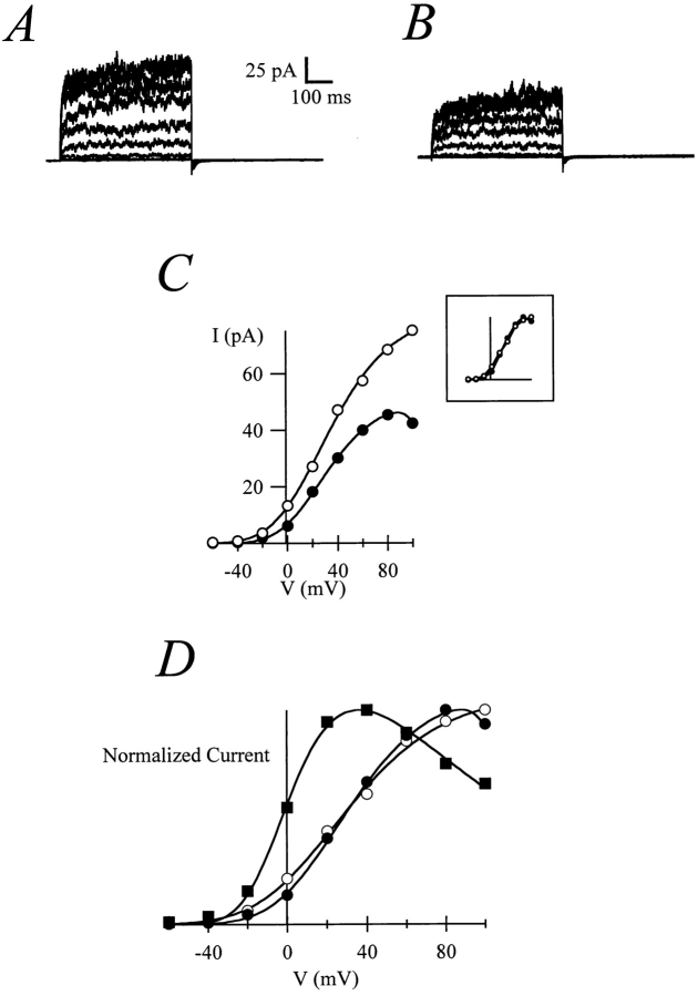 Figure 6. Before maturation, patches expressing r-eag currents show only slight rectification with 20 mM Na+ (A, control traces; B, 20 mM Na+), as can be seen in the I-V plot (C; open circles, control; solid circles, 20 mM NaCl) and more clearly after normalization of the current amplitude (inset). After MPF injection, patches from the same oocyte show rectification comparable to mature oocytes (D; solid squares); for comparison, the normalized current amplitudes from A and B have been included (symbols as in C).