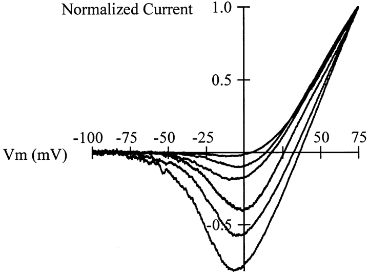 Figure 9. Normalized currents obtained during voltage ramps in CHO-K1 cells expressing r-eag currents. The internal solution contained Cs+ as charge carrier, and the external solution contained K+. From a holding potential of −100 mV, the cell was progressively depolarized to +75 mV during 1 s. Notice the strong variability in the reversal potential, while the shape of the current is similar in all cases.
