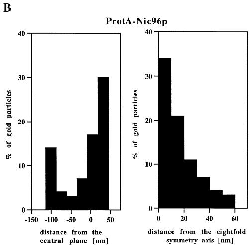 Figure 4. Localization of Nic96p in the ProtA–Nic96p strain. (A) Gallery of selected NPC cross sections showing labeling with the anti–protein A antibody conjugated to 8-nm colloidal gold in Triton X-100–extracted spheroplasts form ProtA–Nic96p cells. Similar to Nsp1p (see Fig. 3), Nic96p is localized at the cytoplasmic (top) and the nuclear periphery (middle) of the central gated channel, and at the terminal ring of the nuclear baskets (bottom). c, cytoplasm; n, nucleus. (B) Quantitation of the gold particle distribution associated with NPCs in the ProtA–Nic96p strain. 80 gold particles were scored. Bar, 100 nm.