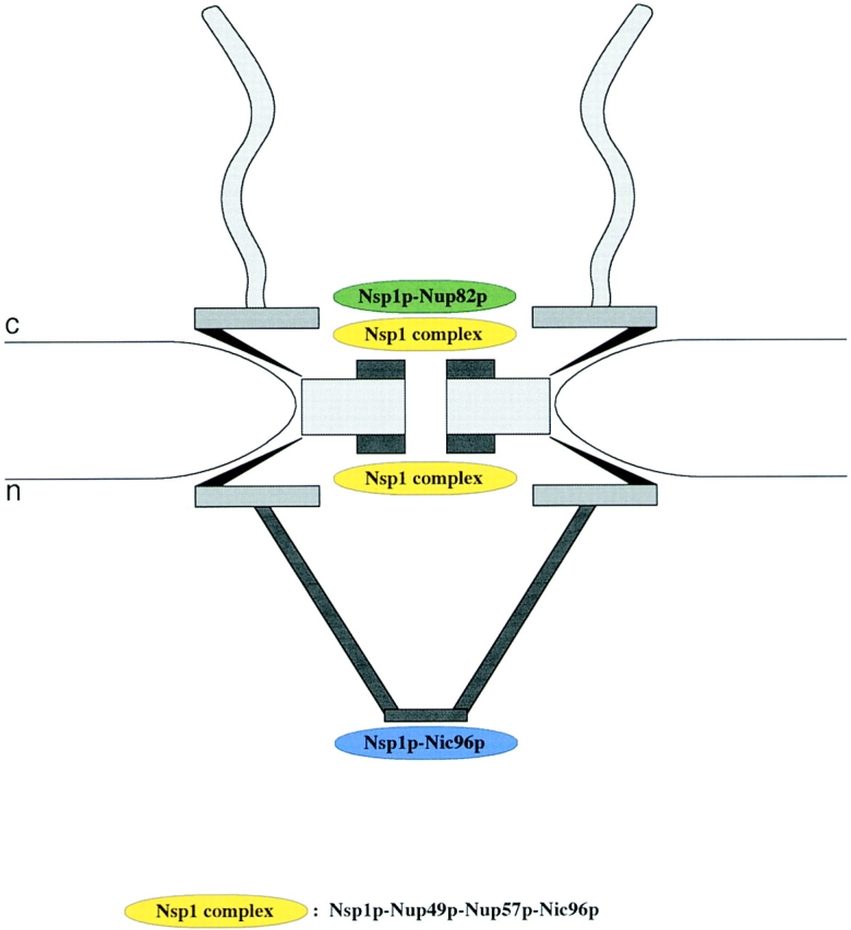 Figure 8. Schematic representation of the yeast NPC with the 3D localization of three Nsp1p subcomplexes. The Nsp1p–Nup49p–Nup57p– Nic96p complex (i.e., the Nsp1p complex) is localized at both the cytoplasmic and nuclear periphery of the central gated channel, and the Nsp1p–Nup82p complex resides only at the cytoplasmic periphery of the central gated channel. In addition, a third Nsp1p complex consisting of Nsp1p interacting with Nic96p is located at the terminal ring of the nuclear baskets. c, cytoplasmic, and n, nuclear side of the NE.