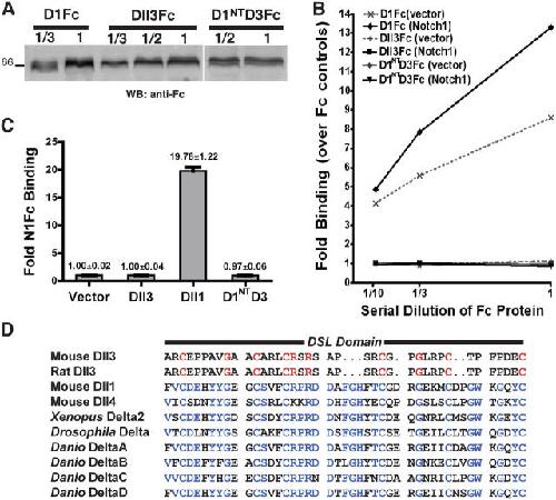 Figure 2. Dll3 does not bind to N. (A) Western Blot (WB) analysis using anti-Fc quantitated Dll3Fc, D1Fc, and D1NTD3Fc for binding assays in B. Numbers represent the dilution of condition media used in the binding assays. (B) 293T cells transfected with vector or N1 were assayed for binding of Fc, Dll3Fc, D1NTD3Fc, and D1Fc by flow cytometry. Fold binding over Fc control is plotted against serial dilutions. (C) Binding of N1Fc to 293T cells transfected with vector or HA-tagged Dll1, Dll3, or D1NTD3 is shown as fold binding over vector control (n = 3). Error bars represent SD. (D) Alignment of the DSL domains of rat and mDll3 with other Dll family members identifies Dll3 as highly divergent. Amino acid sequences conserved in Dll3 are red, whereas amino acid sequences conserved amongst the other Dll-related proteins are blue. |