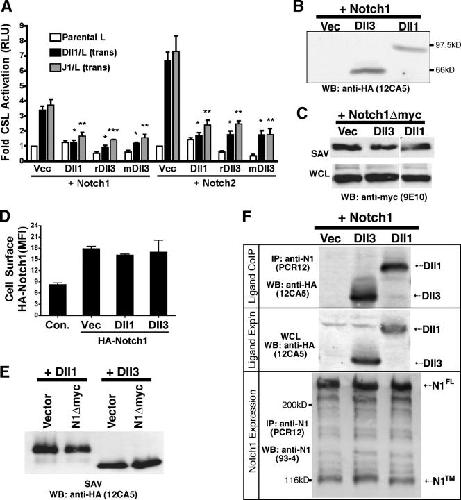 Figure 3. Dll3 cell autonomously inhibits N signaling. (A) NIH 3T3 cells cotransfected with N1 or N2 and either HA-tagged Dll1, rat Dll3 (rDll3), mDll3, or vector along with a CSL reporter cocultured with Dll1, J1, or L cells. Error bars reflect the SD of the mean from four experiments (*, P < 0.01; **, P < 0.001; ***, P < 0.0001). (B) Western blot of HA-tagged Dll1 and Dll3 from NIH 3T3 cells indicates expression in CSL reporter assays in A. (C) 293T cells cotransfected with N1Δmyc and either vector, Dll1, or Dll3 plasmids and cell surface expression of N1 were analyzed after biotinylation/SAV pull-down and anti-myc (9E10) Western blotting. (D) 293T cells transfected with vector or HA-N1 and either vector, Dll1, or Dll3 plasmids were stained live, and mean fluorescence intensity was determined by FACS. Error bars represent SD. (E) 293T cells cotransfected with Dll1 or Dll3 and N1Δmyc or vector plasmids and cell surface expression of Dll1 or Dll3 were determined by biotinylation/SAV pull-down and anti-HA antibody (12CA5) Western blotting. (F) Lysates from 293T cells transfected with N1 and either HA-tagged Dll1, Dll3, or vector were incubated with N1 antibodies and HA antibody Western blot to detect Dll1 or Dll3 (12CA5; top) or with N1 antibody (93–4; bottom). Middle panel is a HA Western blot of Dll1 and Dll3 from WCL. |