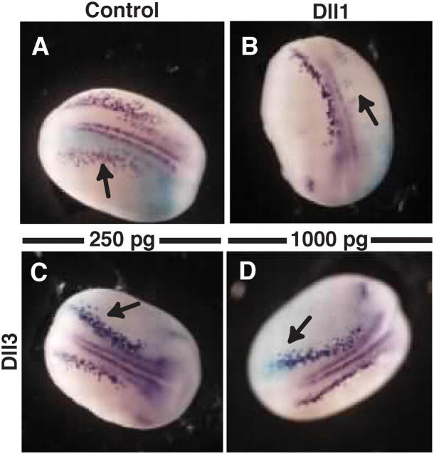 Figure 4. Injection of mDll3 mRNA promotes neurogenesis in X. laevis. Representatives of embryos injected with either synthetic lacZ mRNA alone (A) or in combination with 250 pg Dll1 mRNA (B), 250 pg mDll3 mRNA (C), or 1,000 pg mDll3 mRNA (D) and stained for X-gal (light blue) and β-tubulin (purple) expression. Arrows indicate injection site. |