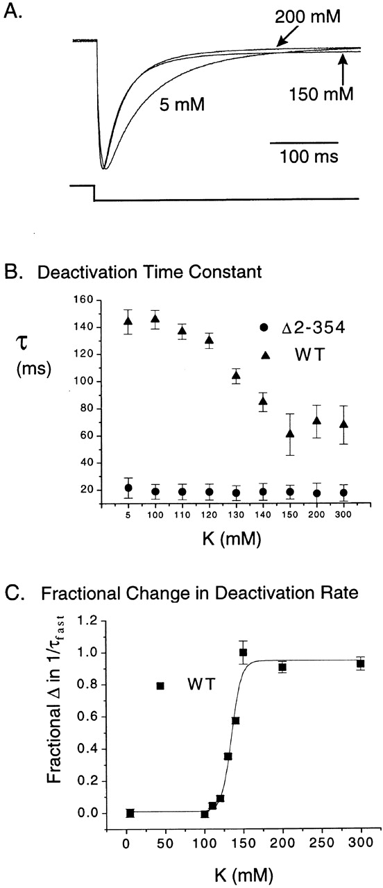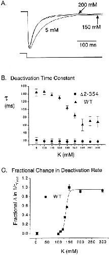 Figure 4. Deactivation rate in HERG channels increases with elevated external K+. (A) Scaled tail currents from WT channels in 5, 150, and 200 mM external K+. Currents were evoked at −100 mV subsequent to a 3-s step to 60 mV. (B) Deactivation time constants at various external K+ concentrations for both WT (n = 6) and Δ2-354 (n = 5) channels for tail currents evoked as described in A. Tail currents were fit with a single exponential function in this case because, at −100 mV, the fast component accounts for >90% of the current. (C) The change in deactivation rate (1/τ) with increasing external K+ exhibits a saturating dose–response behavior with a Hill coefficient of 5.36 ± 0.69. At −100 mV, the forward (activation) rate is negligible and most of the deactivating current is described by the fast deactivation τ (Table I) so the deactivation rate ≅ 1/τfast. As shown, deactivation rate increased in a dose-dependent manner with increased external K+ ions. These data were fitted with the Hill equation: ln[(1 − S′)/S′] = −n(lnK − lnL), where S′= S/S0 is the fraction of sites occupied by the ligand, S is the number of sites occupied, So is the total number of sites available, K is the dissociation constant of the ligand, L is the ligand concentration, and n is the Hill coefficient. We determine S′ using the formula (k − k5)/(k300 − k5), where k is the deactivation rate (1/τ at −100 mV) at any given external potassium concentration, k5 is the rate at 5 mM [K]o, and k300 the rate at 300 mM [K]o. The S′ values at different [K]o (i.e., L) were plotted as fractional increase of deactivation rate in C. The resulting sigmoidal dose–response curve was then fitted with the Hill equation indicated above to obtain the Hill coefficient.