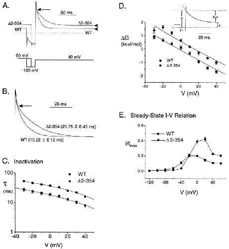 Figure 2. The HERG NH2 terminus promotes C-type inactivation. (A) Inactivating current traces scaled to the peak current from WT and Δ2-354 channels generated using the three-pulse protocol: channels are allowed to fully activate and inactivate during a 3-s prepulse to 60 mV; a subsequent, brief repolarizing pulse to −100 mV allows channels to recover; near the peak of this tail current before deactivation becomes apparent, a third pulse to one of a range of voltages is given to drive channels from the open into the inactivated state (40 mV for the traces shown). The repolarizing pulse is 35 ms in duration for WT, 15 ms for Δ2-354. (Based on our fits, we calculate that recovery is 99.02 ± 0.72%, n = 14, complete for WT and 99.50 ± 0.29%, n = 8 complete for Δ2-354 at the peak of the tail current; i.e., end of recovery phase. This was determined by fitting the recovery phase of the tail currents with a single exponential of the form y = A0 + Ae−t/τ. The fit, which in most cases followed very closely to the peak currents, was extended beyond the peak to a plateau. The current level of the plateau was considered to represent the full recovery from inactivation. The amplitude of the peak tail current was normalized to this value to give the percentage of recovery, the mean values for which are reported above.) Thus, an inactivating current is measured in relative isolation from other kinetic components. Arrowheads point to the steady state inactivation level of WT and Δ2-354 channels. The dashed line indicates the zero current level. The capacitance artifact (∼2 ms) ends at the arrow. Capacitance artifacts are also shown at the beginning of the tail currents upon repolarization. (B) Currents from A scaled to peak and minimum to show the difference in time course. Time constants extracted from single exponential fits are shown along with the error of the fit. The arrow corresponds to the settling of the clamp as shown in A. (C) Inactivation time constants extracted from single exponential fits to the inactivating current illustrated in A are plotted at different voltages (n ≥ 10). (D) Change in free energy as a function of voltage shows that deletion of the NH2 terminus increases the free energy of the inactivated state relative to the open state (n = 6). The free energy change associated with open to inactivated transition can be calculated as ΔGO ↔ I = −RTlnKO ↔ I = −RTln(I/O) = RTln(O/I), where ΔG is the difference in free energy between the open and closed states. I and O are the fraction of channels in the inactivated and open states, respectively, R is the gas constant and T is the temperature. The fraction of open and inactivated channels are measured from the inactivation current as illustrated in the inset: the instantaneous outward current level, indicated as b, reflects the total number of channels that are open and ready to undergo the open to inactivated transition. The value for b is determined by fitting the inactivating current with a single exponential function and extrapolating back to the moment of the voltage change; the fit departs from the recorded current during the capacitive artifact, which has a duration of ∼2 ms. The steady state current level (the channels remaining in O) is indicated as a. Thus, the number of inactivated channels can be calculated as (b − a). Then, at any given voltage, ΔGO ↔ I = RTln(O/I) = RTln[b/(b − a)]. The example shown is a Δ2-354 current. (E) Normalized steady state outward current–voltage relationships for WT and Δ2-354 channels (n = 6). All outward currents are normalized to the maximal tail current level evoked at −100 mV subsequent to a 3-s step to 60 mV, which represents the channel expression level for each oocyte assuming the same single-channel conductance for the two constructs.