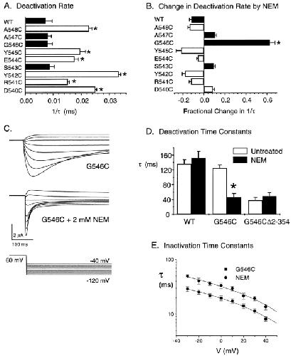 Figure 5. NEM modification of the S4–S5 linker mimics the NH2 terminus deletion. (A) Deactivation rates for cysteine substitutions at each position within the S4–S5 linker region. The open bars with the asterisks indicate the positions where cysteine substitution significantly speeds deactivation rate (n ≥ 3 for each mutant). Note that deactivation rate is not significantly altered by G546C. (B) Fractional change of deactivation rate by NEM modification for all the cysteine substitutions. Positive numbers indicate increased rate. *Dramatic effect on the G546C mutant. (C) Families of tail currents from G546C channels before and after NEM modification. (D) Summary of effects of NEM modification on WT, G546C, and G546C Δ2-354 channels. Time constants were determined by fitting tail currents to a single exponential function because, at −100 mV, the fast component accounts for >90% of the current. The first pair of bars indicates that NEM modification does not significantly affect deactivation time constants for wild-type channels. The second set of bars shows marked effect of NEM modification on G546C mutant. The third set of bars shows that modification of G546C Δ2-354 does not further accelerate the deactivation rate, indicating that NEM and deletion of the NH2 terminus disrupt the same process (n = 6 for each construct). (E) Inactivation time constants measured from G546C channels show that modification of the S4–S5 linker results in slower C-type inactivation (n = 7).