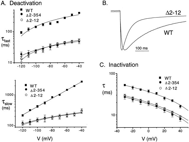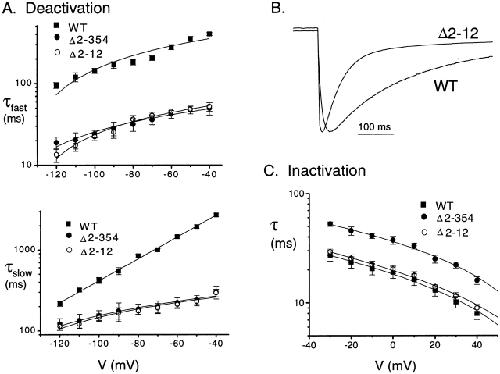 Figure 6. Domains regulating deactivation and inactivation are spatially distinct within the NH2 terminus. (A) Scaled tail currents from Δ2-12 and WT channels show that the small deletion increases deactivation rate. (B) Fast and slow deactivation time constants for WT (n > 10), Δ2-354 (n > 10), and Δ2-12 (n = 6) channels indicate that the two deletions have similar effects on deactivation kinetics. (C) Inactivation time constants for HERG WT (n > 10), Δ2-354 (n > 10), and Δ2-12 (n = 6) show that the small deletion does not significantly alter the inactivation rate (P > 0.6 at 0.05 confidence interval for each voltage).