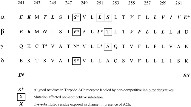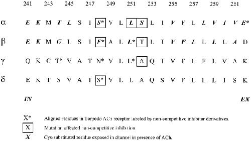 Figure 2. Aligned sequences of the M2 segments of mouse-muscle ACh receptor subunits. The numbering is that of the α subunit. The predicted membrane-spanning segments correspond to αM243 to αV261. The intracellular (IN) and extracellular (EX) ends are indicated. *Residues are aligned with residues in the ACh receptor from Torpedo electric tissue that were labeled by noncompetitive inhibitor derivatives. Mutations of the boxed-in residues affected channel block by QX-222. Cysteines substituted for the residues in bold italics are exposed in the channel in the presence of ACh (tested only in α and β). See text for references.