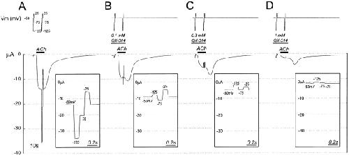 Figure 4. Inhibition of ACh-induced current in αL251C by QX-314 at different holding potentials. The top trace shows the holding potential. Both before and ∼3 s after the application of 25 μM ACh, the holding potential was stepped from −50 mV to −125, −75, −25, and back to −50 mV. The bottom trace shows the current. (inset) The peak ACh-induced current during the voltage steps minus the current during the voltage steps before ACh was added, with an expanded time axis. (A) No QX-314, (B) 0.1 mM QX-314, (C) 0.3 mM QX-314, (D) 1 mM QX-314. The four sections are part of a single experiment. Between the sections shown, the oocyte was washed and QX-314 at the indicated concentration was applied for 45 s before, and in addition to, the time indicated in the traces.