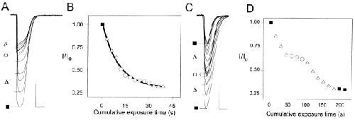 Figure 5. The effect of QX-314 on the irreversible inhibition of the ACh-induced current in two mutants. (A and B) αL258C. (C and D) αS248C. A and C show the test responses to ACh between applications of MTSEA in the presence of ACh and in the presence or absence of QX-314. B and D show the test currents as a function of cumulative exposure time to MTSEA. (▪) Initial responses and, in C and D, also extra final responses without any further application of MTSEA. (▵) MTSEA in the presence of ACh. (○) MTSEA in the presence of both ACh and QX-314. ACh was applied at 25 μM to αL258C and at 100 μM to αS248C. 1 mM MTSEA was applied in 3-s pulses to αL258C, and 1.5 mM MTSEA was applied in 15-s pulses to αS248C. QX-314 was applied at 1 mM to αL258C and at 0.2 mM to αS248C. The calibration bars are 3 s and 5 μA.