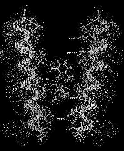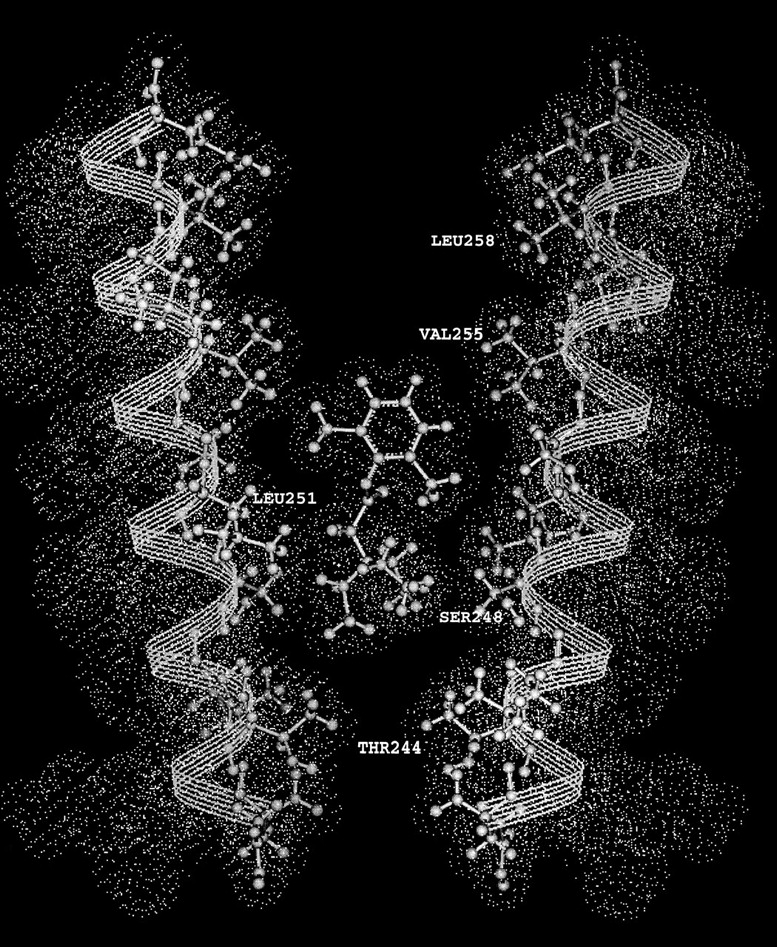 Figure 9. A model of QX-314 binding in the channel between two αM2 segments. The M2 segments are drawn as α helices. The dots represent the van der Waals surfaces. The drawing was made on a Silicon Graphics workstation running Insight II.