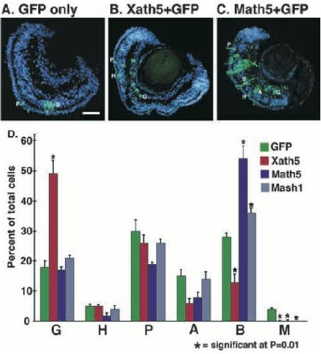 Fig. 6. In vivo lipofection of Math5 promotes retinal bipolar cell fates. Embryos were transfected at stage 18 in the region of the optic vesicle with DNA for GFP alone (A) or GFP in combination with Xath5 (B), Math5 (C) or Mash1 (not shown). At stage 41 these embryos were fixed, cryosectioned and stained with Hoechst dye to visualize the retinal cell layers. GFP-labeled cells were scored in retinal sections by laminar position and morphology. In section of embryos transfected with Xath5, there are more labeled cells in the RGC layer (B), while sections of embryos transfected with Math5 show both a larger number of GFP-labeled cells overall and more labeled bipolar cells (C). Bipolar cells were scored as cells with distinct cell bodies in the INL and with thin processes extending radially but not extending into the ONL or GCL. These can be distinguished from Müller glial cells, which are radially oriented but have a more complex morphology (see Dorsky et al, 1995). (D) Percentage of retinal cell types labeled following transfection with DNA for GFP (green, n=432 cells from 5 eyes), GFP plus Xath5 (red, n=939 cells from 5 eyes), Math5 (navy, n=866 cells from 7 eyes) or Mash1 (light blue, n=440 cells from 6 eyes). Xath5 data are derived from Kanekar et al. (1997) and are included here for comparison. Expression of Xath5 biases progenitors toward RGC fate, while both Math5 and Mash1 promote the formation of bipolar cells. The per cent representation of each cell type was calculated as a weighted average. Error bars indicate SEM; asterisk, P<0.01 by Student t-test. Cell types on the graph are listed from left to right in rough order of birth. Abbreviations: G, retinal ganglion cell; B, bipolar cell; P, photoreceptor; A, amacrine cell; H, horizontal cell. Scale bar 0.5 μm.