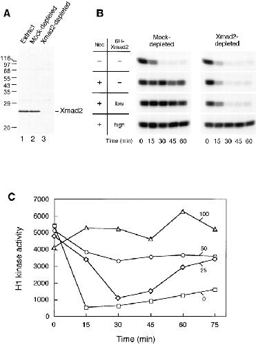 Figure 1. Excess Xmad2 protein inhibits exit from mitosis in CSF-arrested extracts. (A) Immunoblot of Xmad2 in egg extracts (lane 1), in mock-depleted extracts (lane 2), and in Xmad2-depleted extracts (lane 3). Extracts shown in lanes 2 and 3 were used in the experiment shown in B. The migration of molecular size standards and Xmad2 is indicated on the left and right, respectively. (B) Autoradiogram of histone H1 kinase assay. Mock- or Xmad2-depleted CSF-arrested egg extracts were treated as indicated on the left: low 6H-Xmad2, recombinant 6H-Xmad2 protein supplemented to the level of endogenous protein; high 6H-Xmad2, 6H-Xmad2 added to 17-fold the concentration of endogenous protein. After 1 h of incubation on ice, sperm nuclei (10,000/μl) were added to all samples and incubated for 10 min at 23°C, followed by incubation with nocodazole (lower three panels) for another 10 min. The metaphase arrest was then released by the addition of calcium chloride to inactivate CSF activity. Aliquots were taken immediately before calcium was added (time 0) and every 15 min thereafter to determine Cdc2-associated histone H1 kinase activity. (C) Dose-dependent inhibition of Cdc2 inactivation by Xmad2. Xmad2 protein at the indicated concentrations (□, 0; ⋄, 25; ○, 50; ▵, 100 ng/μl of extract, respectively) was preincubated with CSF-arrested extracts, followed by incubation with sperm nuclei (500/μl) in the absence of nocodazole. H1 kinase assays were performed as described in B and incorporation of 32P into H1 was quantified using a PhosphorImager.