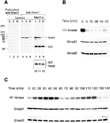 The spindle checkpoint prevents the metaphase to anaphase transition in cells containing defects in the mitotic spindle or in chromosome attachment to the spindle. When the checkpoint protein Xmad2 is depleted from Xenopus egg extracts, adding Xmad2 to its endogenous concentration fails to restore the checkpoint, suggesting that other checkpoint component(s) were depleted from the extract through their association with Xmad2. Mass spectrometry provided peptide sequences from an 85-kD protein that coimmunoprecipitates with Xmad2 from egg extracts. This information was used to clone XMAD1, which encodes a homologue of the budding yeast (Saccharomyces cerevisiae) checkpoint protein Mad1. Xmad1 is essential for establishing and maintaining the spindle checkpoint in egg extracts. Like Xmad2, Xmad1 localizes to the nuclear envelope and the nucleus during interphase, and to those kinetochores that are not bound to spindle microtubules during mitosis. Adding an anti-Xmad1 antibody to egg extracts inactivates the checkpoint and prevents Xmad2 from localizing to unbound kinetochores. In the presence of excess Xmad2, neither chromosomes nor Xmad1 are required to activate the spindle checkpoint, suggesting that the physiological role of Xmad1 is to recruit Xmad2 to kinetochores that have not bound microtubules.