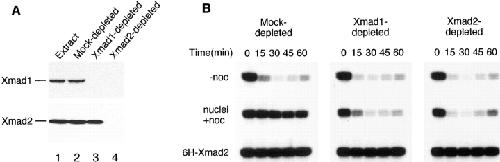 Figure 10. Mitotic arrest induced by excess Xmad2 is independent of Xmad1. (A) Immunoblots of Xmad1 (top) and Xmad2 (bottom) in CSF-arrested extracts (lane 1), mock- (lane 2), Xmad1- (lane 3), or Xmad2-depleted (lane 4) extracts. (B) Excess Xmad2 can still induce a mitotic arrest in the absence of Xmad1. The extracts shown in lanes 2–4 of A were used. Top panels, extracts were incubated with sperm nuclei alone. Middle panels, nocodazole and sperm nuclei were added to activate the spindle checkpoint. Bottom panels, excess 6H-Xmad2 was added to the extracts in the absence of sperm nuclei and nocodazole. H1 kinase activities were determined before and at various times after calcium addition as described for Fig. 1 B.