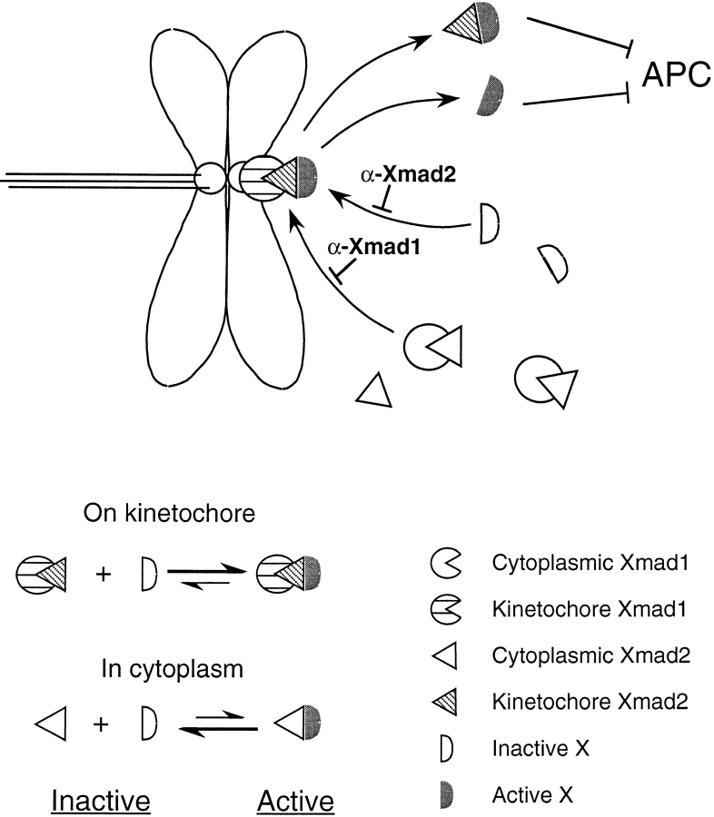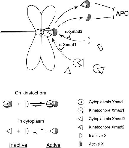 Figure 11. A model for how Xmad1 and Xmad2 work to activate the spindle checkpoint. Binding of Xmad1 to unattached kinetochores enables its associated Xmad2 to interact with a downstream checkpoint component X. This interaction converts X into a form that is capable of directly or indirectly inhibiting the anaphase-promoting complex (APC). The interaction between Xmad2 and X is unstable when Xmad2 is not associated with kinetochores, so that the checkpoint is not activated without unattached kinetochores. Increasing the global Xmad2 concentration drives the complex formation by mass action even in the absence of kinetochores. At a high enough concentration of Xmad2, the level of Xmad2–X complex becomes comparable to that induced through kinetochore-associated Xmad2 and results in constitutive activation of the spindle checkpoint. A likely candidate for X is Cdc20.