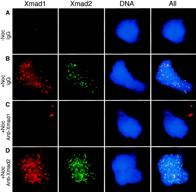 Figure 9. Anti-Xmad1 antibodies interfere with Xmad1 and Xmad2 binding to kinetochores. Metaphase chromosomes were assembled in egg extracts and treated with (B–D) or without (A) nocodazole. C and D, anti-Xmad1 and anti-Xmad2 antibodies, respectively, were added to the extracts 1 h before the addition of nocodazole. The chromosomes were isolated through a sucrose cushion and stained for Xmad1 and Xmad2. For D, Xmad2 staining is essentially the same if the anti-Xmad2 antibody was omitted during the immunofluorescent staining procedures (data not shown). Aggregates of chromosomes from several sperm nuclei are shown.
