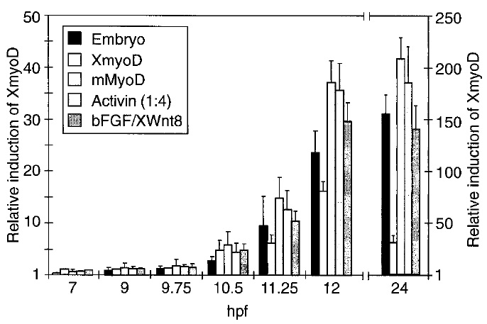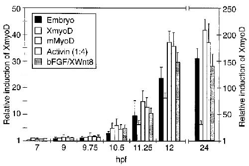 9.75 and 10.5 hpf. The relative XMyoD induction is calculated as