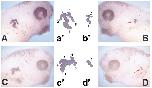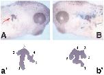 the pronephric region of the injected side (B). (a9 and b9). Enlarged, diagrammatic representation of the pronephroi in A and B. For