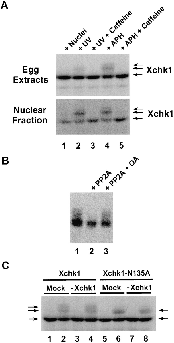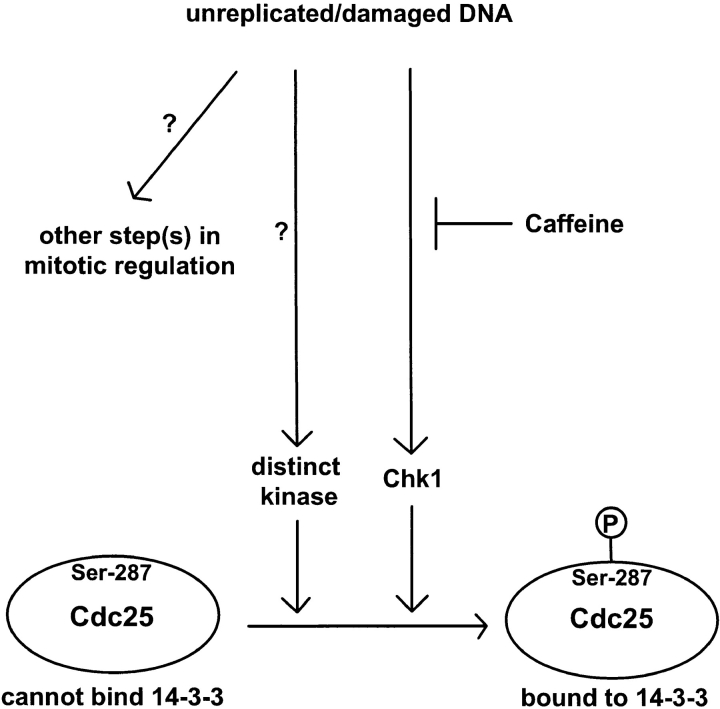 We have analyzed the role of the protein kinase Chk1 in checkpoint control by using cell-free extracts from Xenopus eggs. Recombinant Xenopus Chk1 (Xchk1) phosphorylates the mitotic inducer Cdc25 in vitro on multiple sites including Ser-287. The Xchk1-catalyzed phosphorylation of Cdc25 on Ser-287 is sufficient to confer the binding of 14-3-3 proteins. Egg extracts from which Xchk1 has been removed by immunodepletion are strongly but not totally compromised in their ability to undergo a cell cycle delay in response to the presence of unreplicated DNA. Cdc25 in Xchk1-depleted extracts remains bound to 14-3-3 due to the action of a distinct Ser-287-specific kinase in addition to Xchk1. Xchk1 is highly phosphorylated in the presence of unreplicated or damaged DNA, and this phosphorylation is abolished by caffeine, an agent which attenuates checkpoint control. The checkpoint response to unreplicated DNA in this system involves both caffeine-sensitive and caffeine-insensitive steps. Our results indicate that caffeine disrupts the checkpoint pathway containing Xchk1.