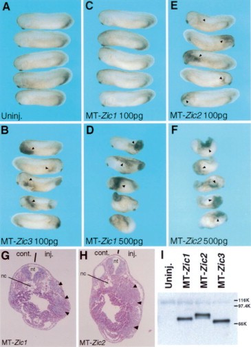 Fig. 4. Zic1 or Zic2 overexpression induces ectopic pigment cell expression in embryo, as does overexpression of Zic3. A total of 100 or 500 pg of MT-Zic3 (B), MT-Zic1 (C, D), or MT-Zic2 (E, F) mRNA was injected into two blastomeres of 2-cell stage embryos, which were then cultured to stage 28â29. Clusters of pigment cells appeared in MT-Zic3, MT-Zic1 or MT-Zic2 mRNA-injected embryos (B,D,E,F, arrowheads). Transverse sections of MT-Zic1 (G) or MT-Zic2 (H) mRNA-injected embryos. A total of 250 pg of MT-Zic1 (G) or 125 pg of MT-Zic2 (H) mRNA was injected into one blastomere of 2-cell stage embryos and embryos were cultured to stage 35â36. Ectopic expression of presumptive mesenchymal tissues was observed in the MT-Zic1 or MT-Zic2 mRNA-injected side (G,H, arrowheads). (I) Western blot analysis of each Zic protein level in MT-Zic3, MT-Zic1 or MT-Zic2 mRNA-injected embryos. A total of 100 pg of MT-Zic3, MT-Zic1 or MT-Zic2 mRNA was injected into two blastomeres of 2-cell stage embryos and cultured to stage 10.5. A total of 10 μg of protein prepared from whole embryo was analyzed by Western blot analysis using an anti-myc antibody. |