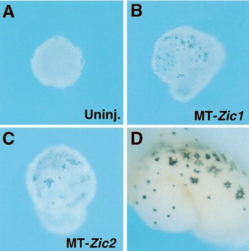 Fig. 5. The pigment cells expressed by Zic1 or Zic2 overexpression in animal cap explant. (A) Uninjected animal cap explant. A total of 250 pg of MT-Zic1 (B) or a total of 125 pg MT-Zic2 (C) mRNA was injected into two animal blastomeres of 2-cell stage embryos obtained by the mating between albino female and wild type males. Animal caps were explanted at stage 9 and cultured. (D) A magnified view of the abdominal region of the control embryo at the same time as amimal cap explant (stage 45). The pigment cells appeared in the MT-Zic1 or MT-Zic2 overexpressed animal cap explants are similar to the melanocytes which are derived from neural crest. |